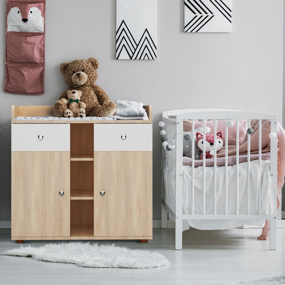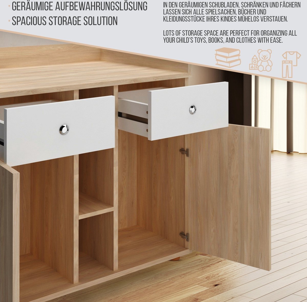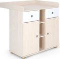 Eenvoudig ontwerp en veel opbergruimte vormen de moderne commode. In twee lades, twee kasten en drie open vakken is ruimte voor luiers, kleding, verzorgingsproducten en al het andere dat altijd bij de hand moet zijn bij het dagelijks verschonen van luiers. Luiers kunnen comfortabel verschoond worden op de ruime verschoonruimte. De vriendelijke houttinten passen in iedere kinderkamer en zijn te combineren met een grote verscheidenheid aan meubelen.