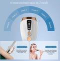 Dankzij de ingebouwde koeltechnologie verlaagt het apparaat de temperatuur tijdens het flitsen tot 8°C (46°F), waardoor je geen pijn of ongemak ervaart tijdens de behandeling. Dit maakt het ontharings-proces niet alleen effectief, maar ook uiterst comfortabel. Het apparaat beschikt over 6 instelbare energieniveaus, waarmee je de intensiteit kan aanpassen aan je huidtype en haar groeisnelheid. Begin bij het laagste niveau en verhoog geleidelijk voor de beste resultaten.