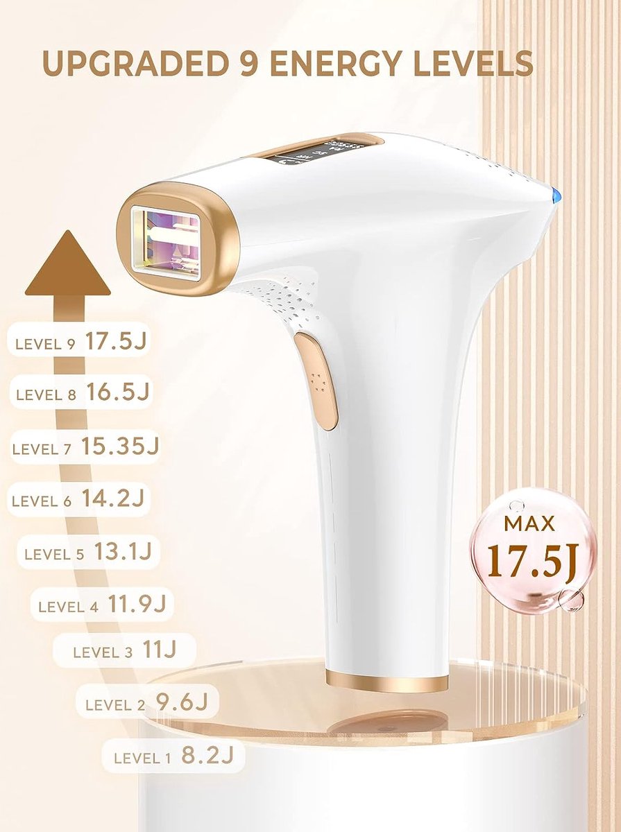 - Met 9 verschillende standen kun je de intensiteit aanpassen op jouw huidtype en haarkleur.