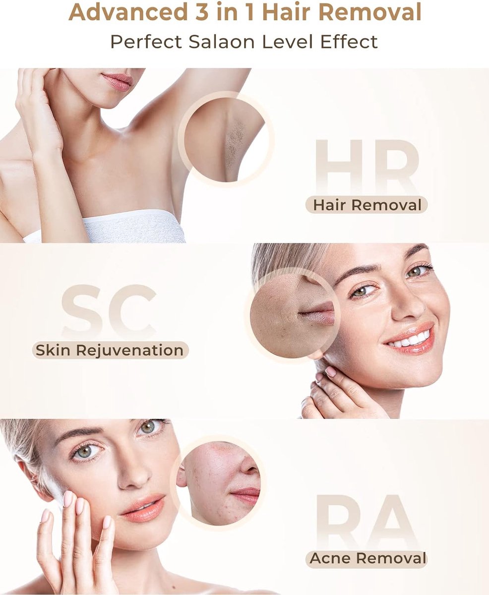 - Met 3 verschillende modi (HR/SC/RA) kun je de behandeling aanpassen aan jouw wensen en behoeften. Huidverjonging, Acne behandeling of ontharing.