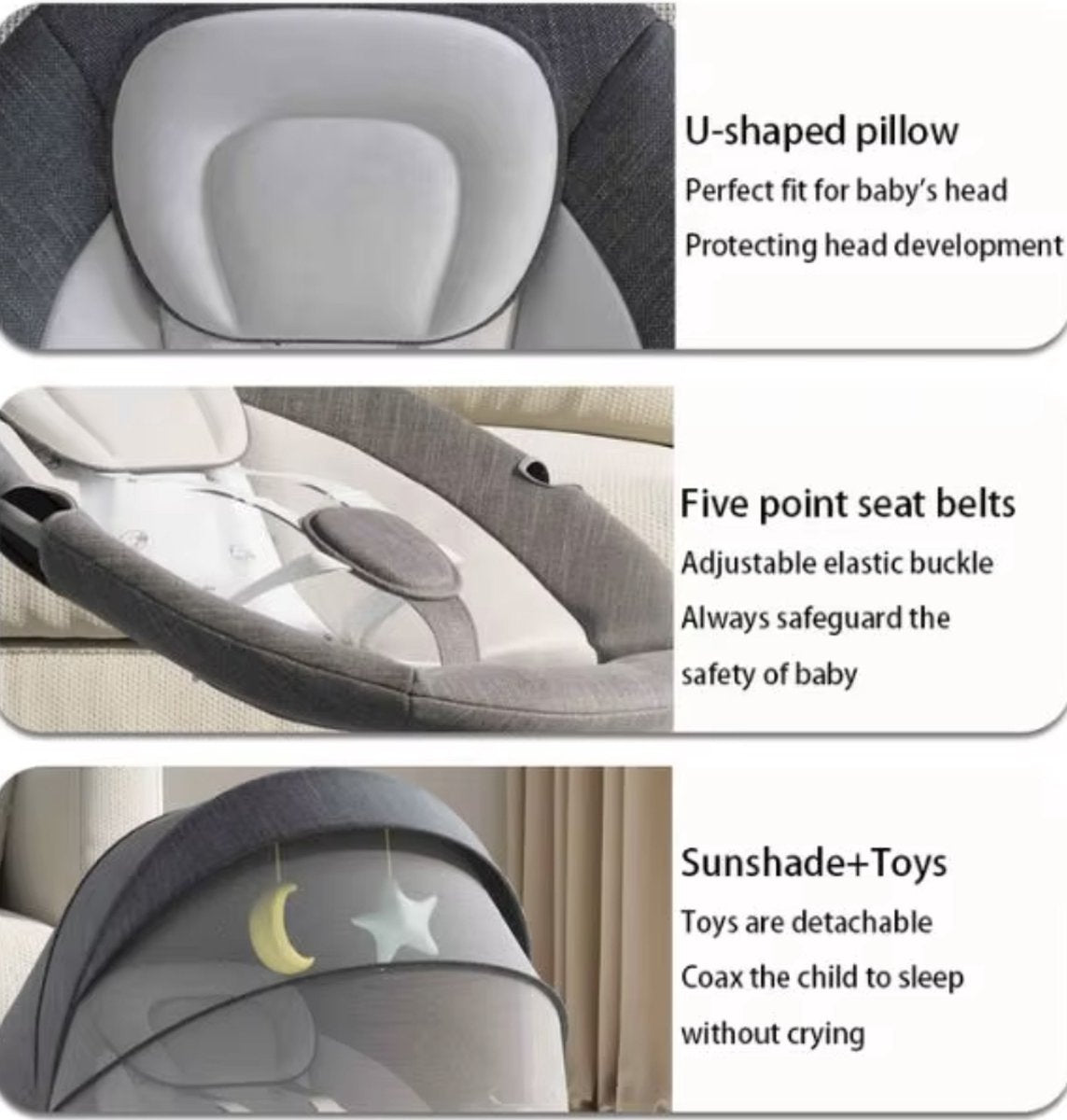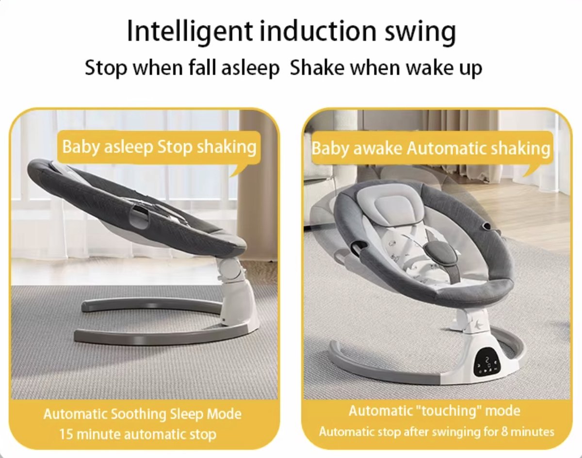 - Veilige Schommelfunctie met 5 Standen: Kies uit vijf verschillende schommelhoeken (16°, 25°, 30°, 45°, 60°) om de ideale beweging te creëren die uw baby helpt ontspannen en kalmeren.