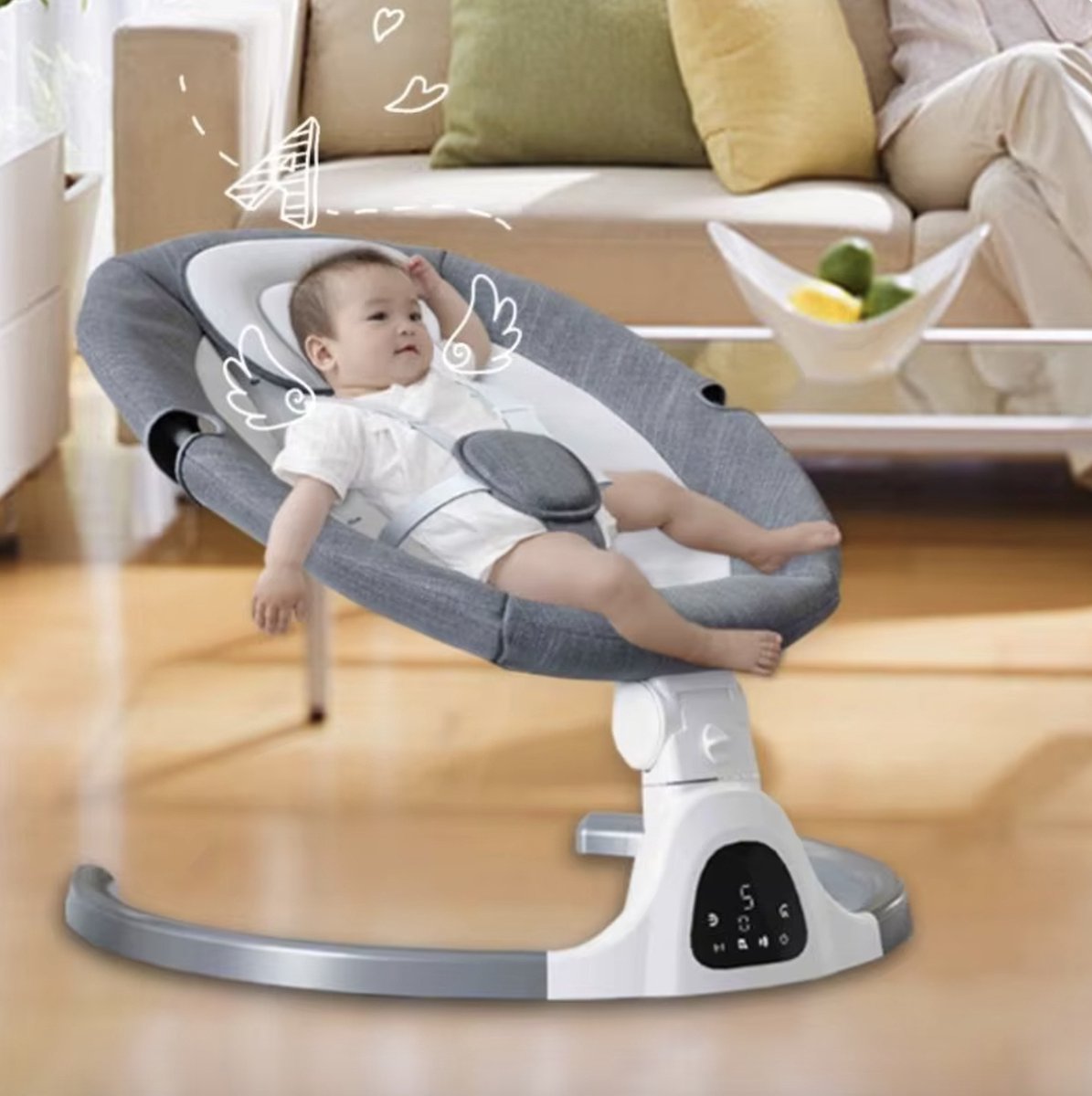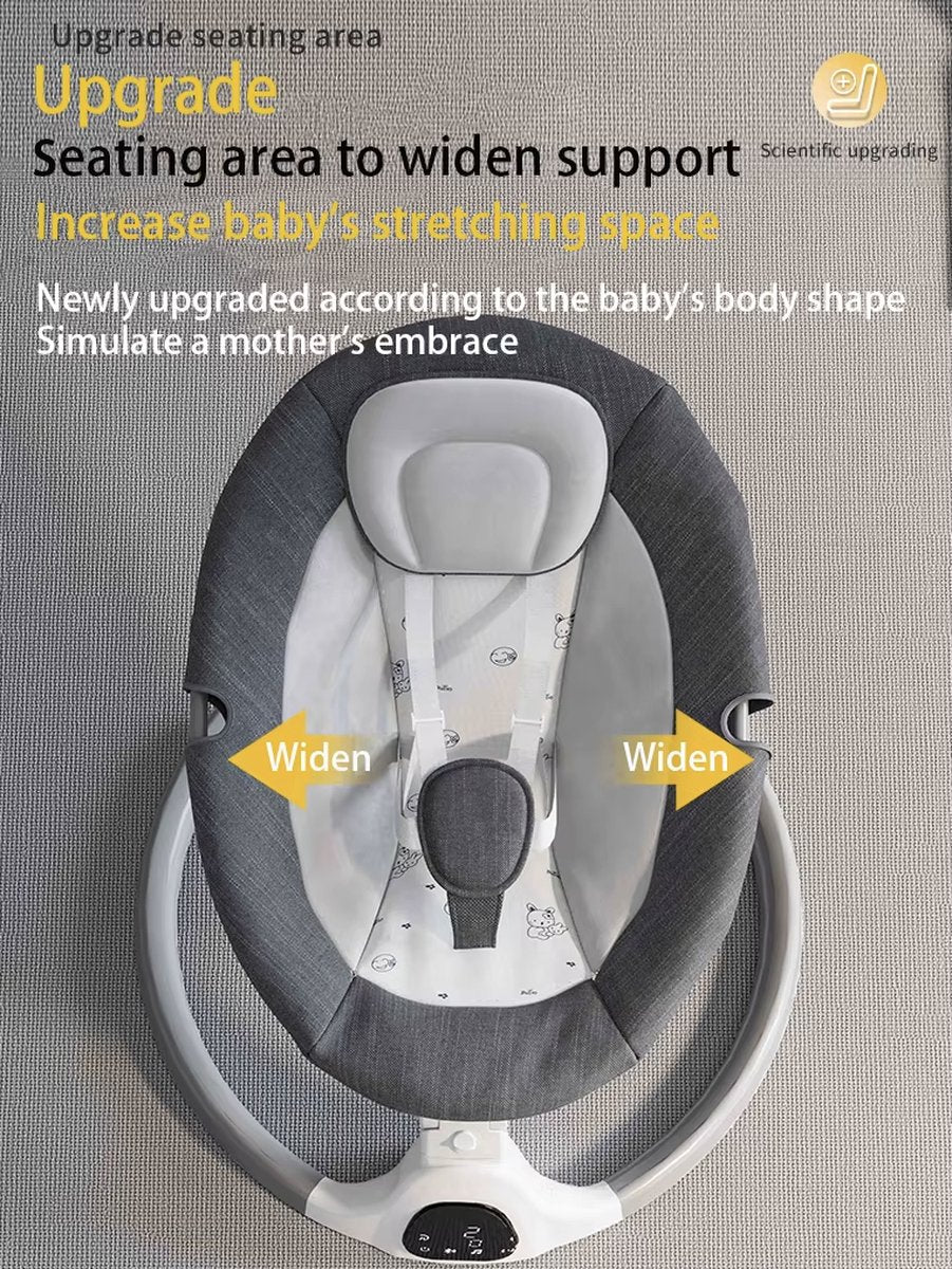 De wipstoel is uitgerust met een elektrische schommelfunctie die vijf verschillende standen heeft, variërend van 16 tot 60 graden, zodat u de perfecte schommelhoek kunt kiezen die past bij de behoeften van uw baby. De geïntegreerde Bluetooth-functie maakt het mogelijk om rustgevende muziek af te spelen, terwijl de afstandsbediening u volledige controle geeft over alle instellingen zonder dat u uw baby hoeft te storen. De stoel is voorzien van een comfortabele 5-punts veiligheidsgordel, een zachte bekleding van kristalfluweel en een muskietennet om uw kindje te beschermen tegen insecten.