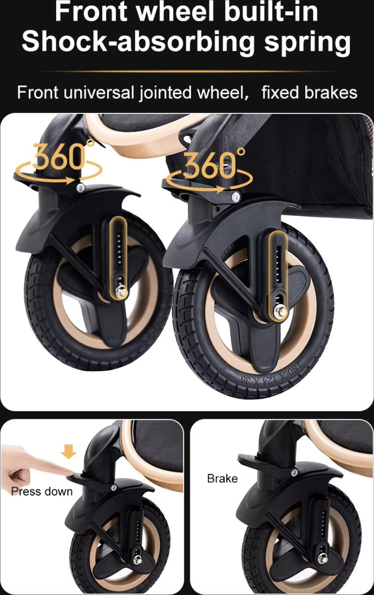 - 360 graden draaibare wielen: De voorwielen draaien soepel in alle richtingen, zodat je de kinderwagen met minimale inspanning kunt manoeuvreren. De wielen zijn bovendien voorzien van vering om schokken te absorberen, wat zorgt voor een soepele rit.