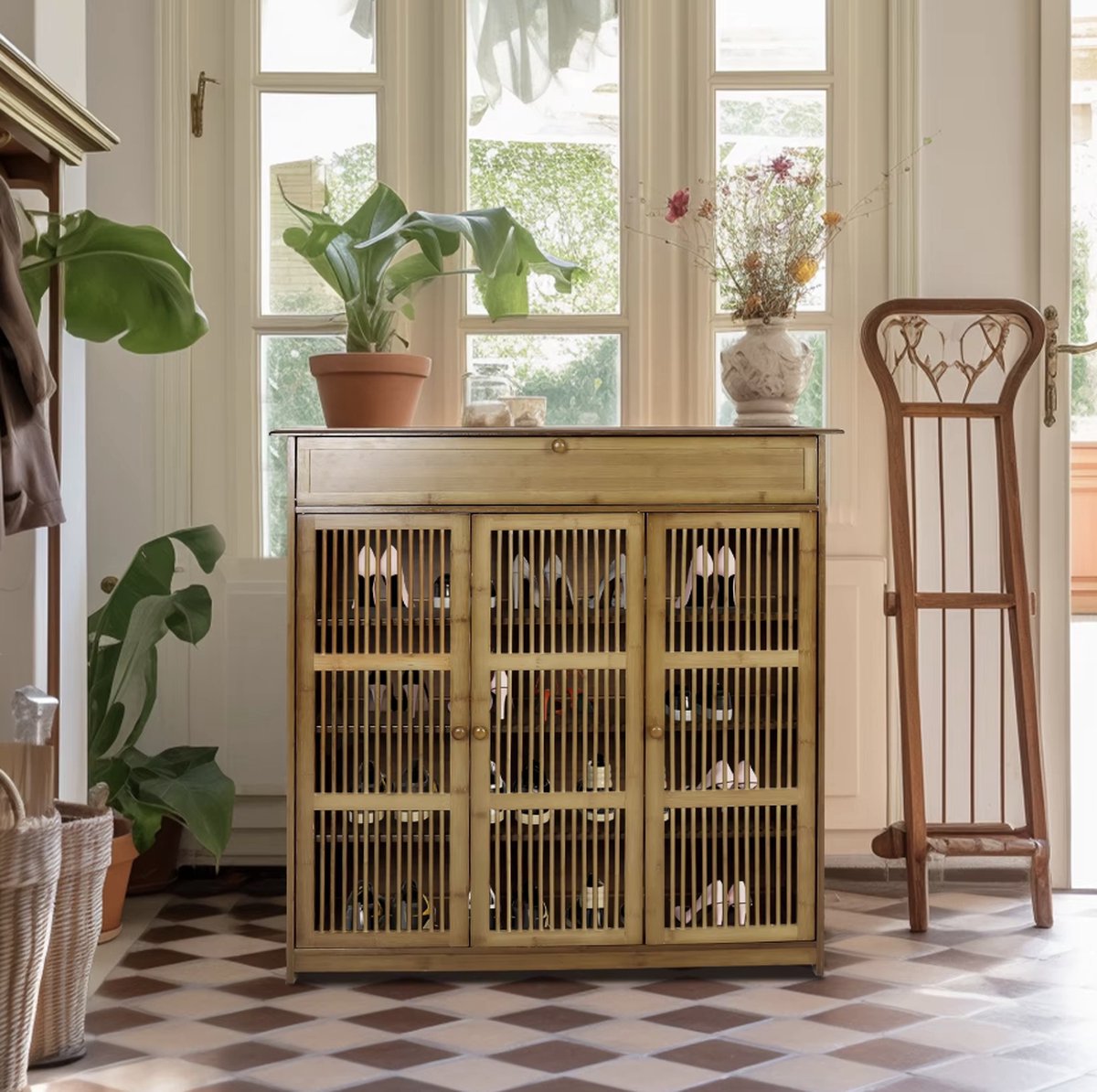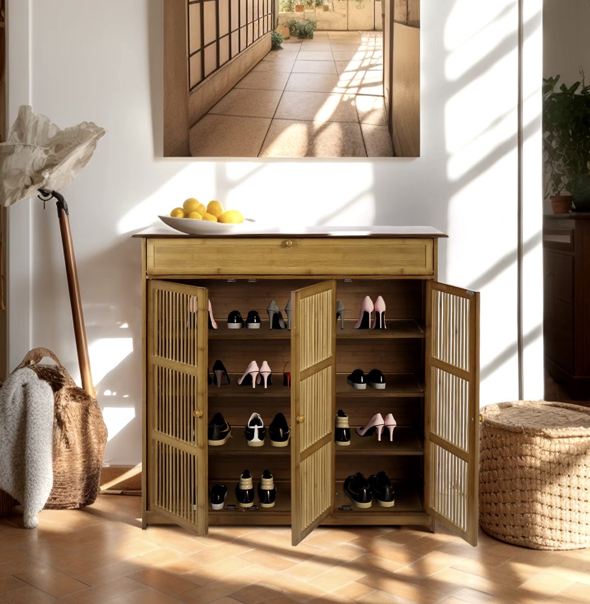 J&R Schoenenkast – Stijlvolle Bamboe Kast met 3 Deuren, 4 Planken en Opbergvak