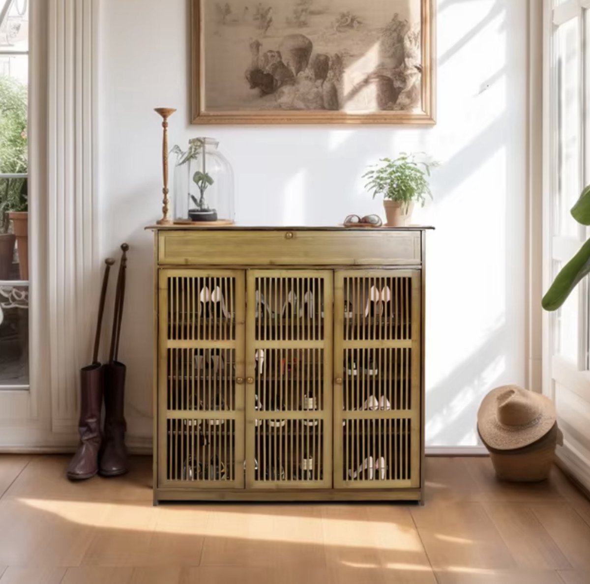 - Natuurlijke materialen: Gemaakt van stevig bamboe, MDF en ijzer, biedt deze schoenenkast zowel duurzaamheid als een natuurlijke, stijlvolle uitstraling.