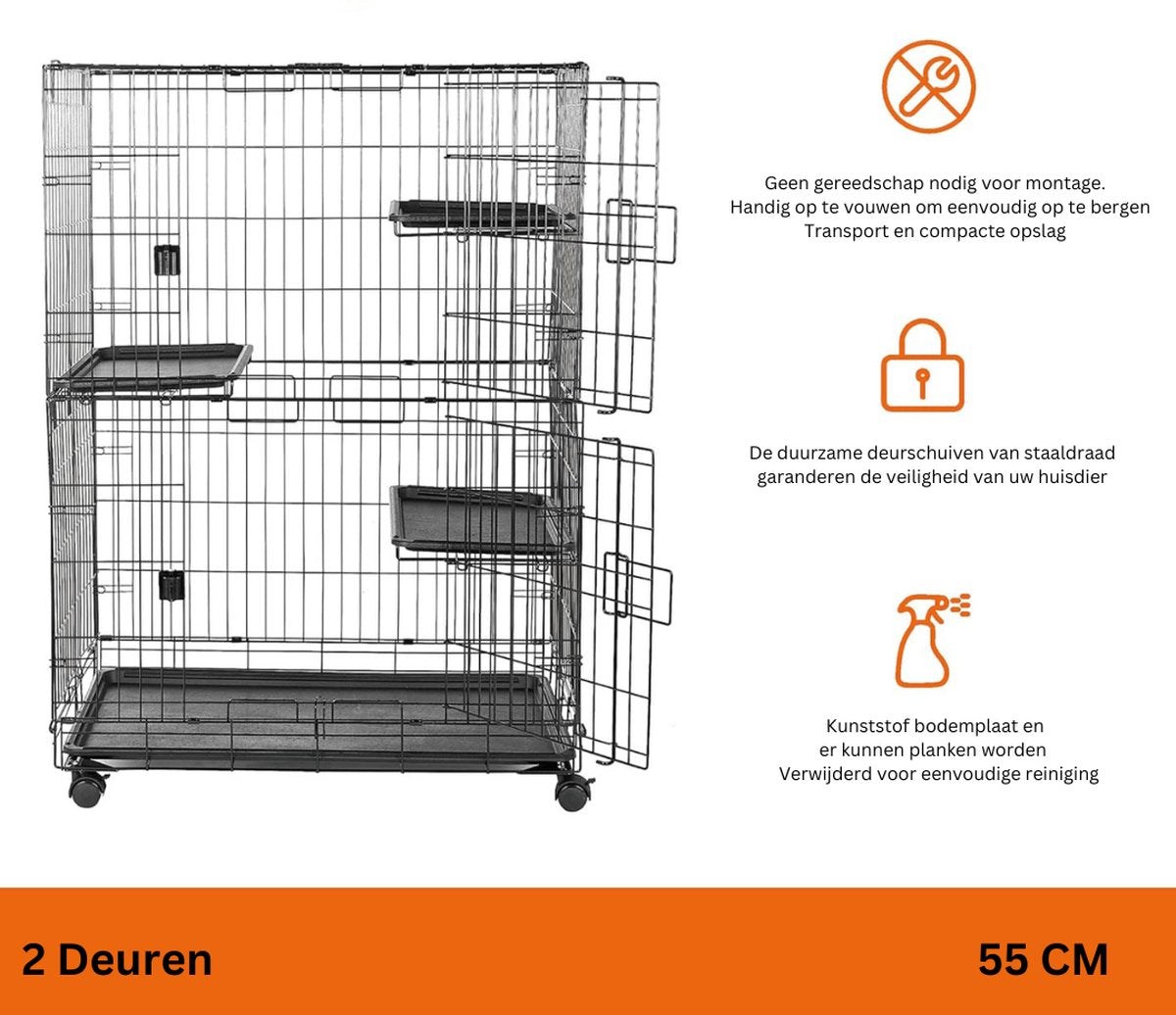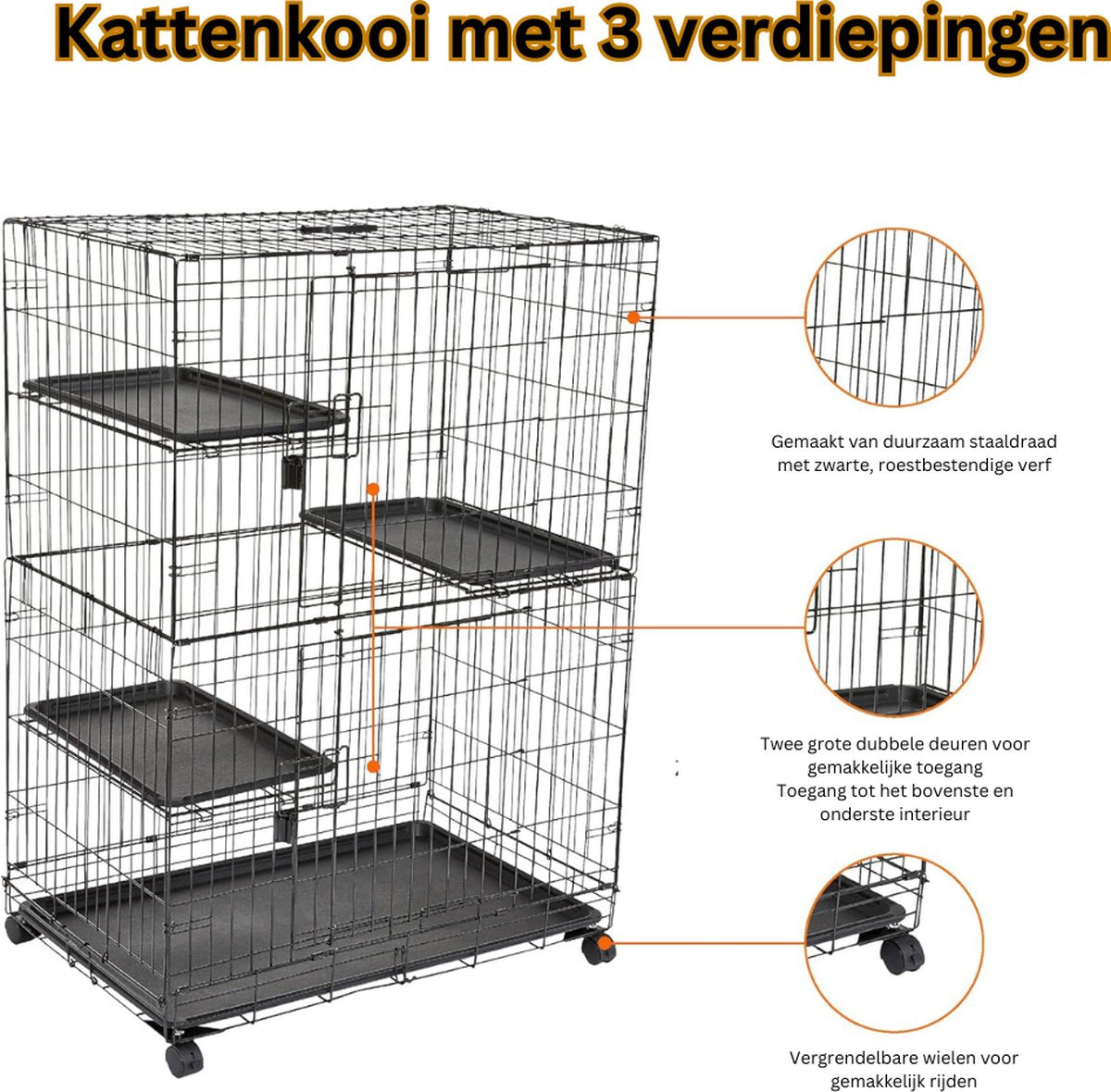 Ben je op zoek naar een professionele kattenkooi voor thuis? Dan is deze Kattenkooi met 3 verdiepingen precies wat je nodig hebt! Dit duurzame en opvouwbare kattenverblijf met stevige metalen constructie, wielen voor gemakkelijke verplaatsing, en drie ruime verdiepingen zorgt voor de perfecte speel- en rustplaats voor je kat, alsof je ze in hun eigen veilige fort zet. Dankzij het inklapbare ontwerp kun je de kooi eenvoudig opbergen of meenemen.