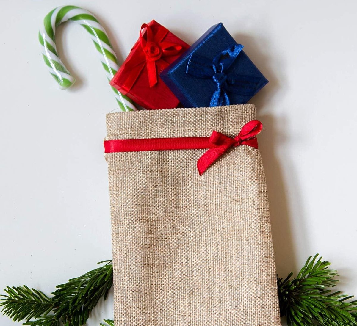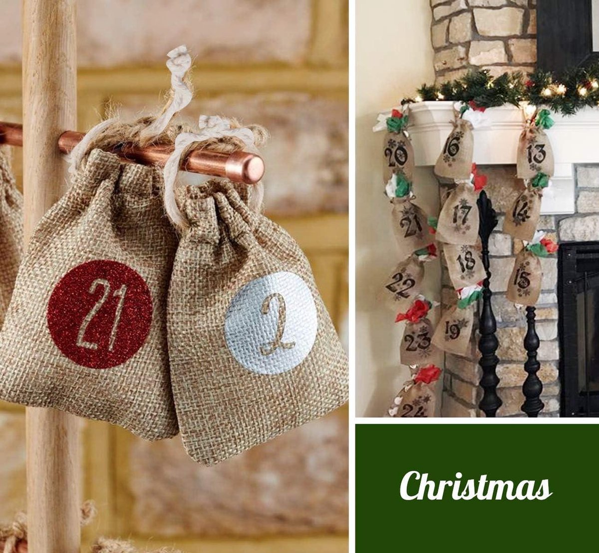 Vakantieverrassing: Leg verschillende kleine cadeaus in 25 jute zakken, die aan de muur, aan de kerstboom, aan de deur of aan de schoorsteenmantel kunnen hangen. Elke dag biedt kerstverrassingen.