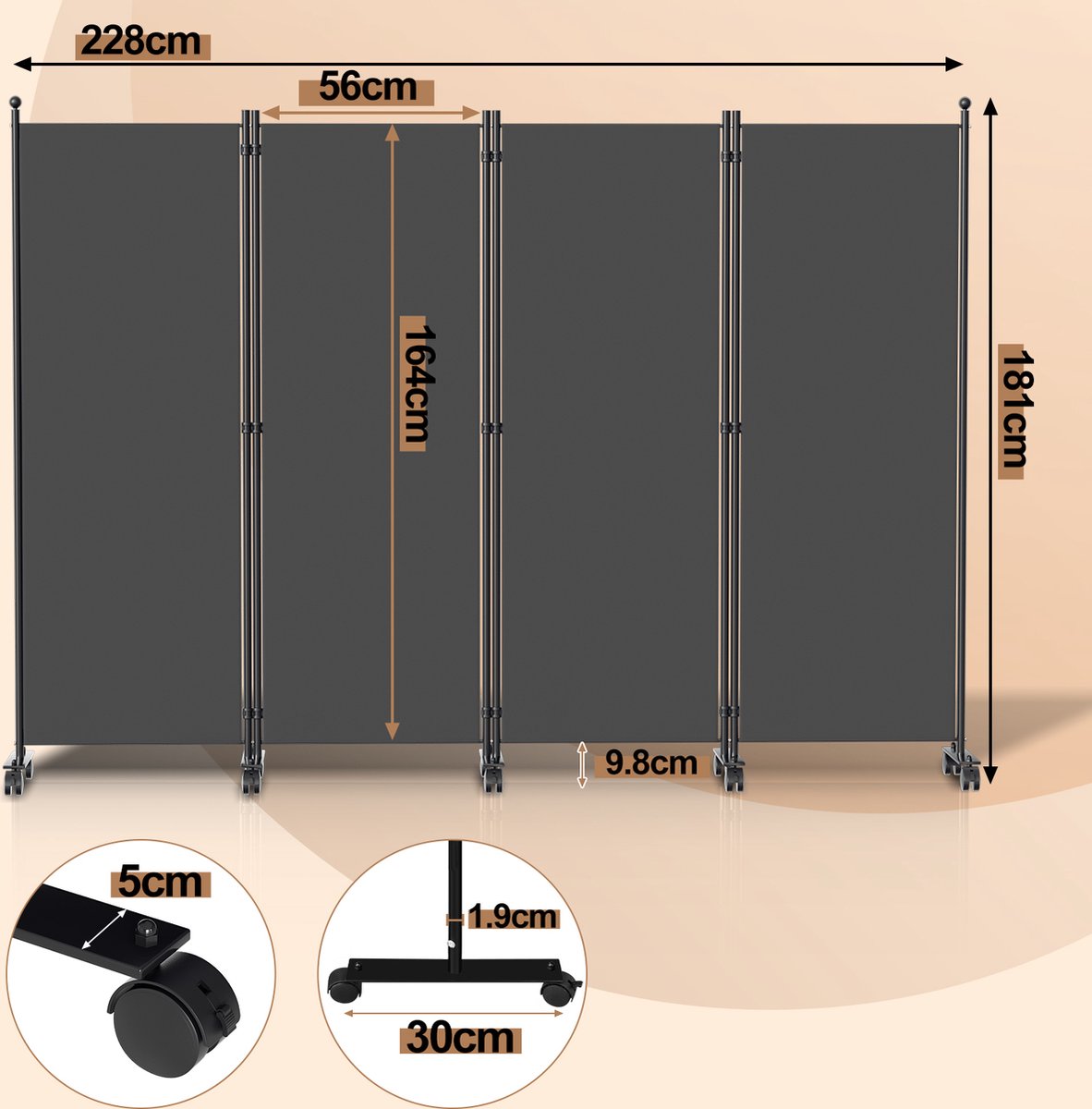 Kamerscherm op wielen met 4 panelen - 228 x 181 cm - Kamerverdeler Tuin Spaanse Muurscheiding Antraciet