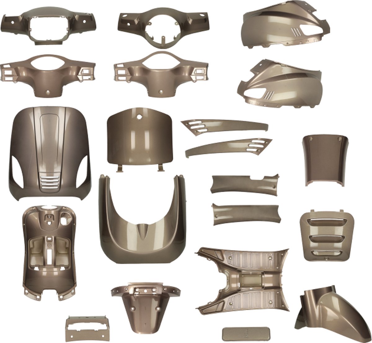 Voordelig en mooie glans champagne kappenset passend op o.a. diverse merken scooters zoals AGM en BTC. Deze kappensets zijn leverbaar in diverse moderne kleuren zoals hoogglans zwart, mat zwart en Nardo Grey. Deze kappen zijn ideaal om je scooter na schade goedkoop op te knappen, te stylen of eenvoudig een nieuwe sportieve look te geven. Dit kappenset is goed te combineren met de smoke verlichting zoals o.a. de smoke knipperlichten en achterlicht.
