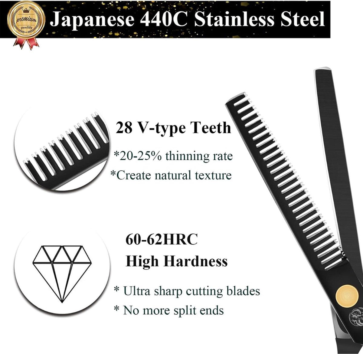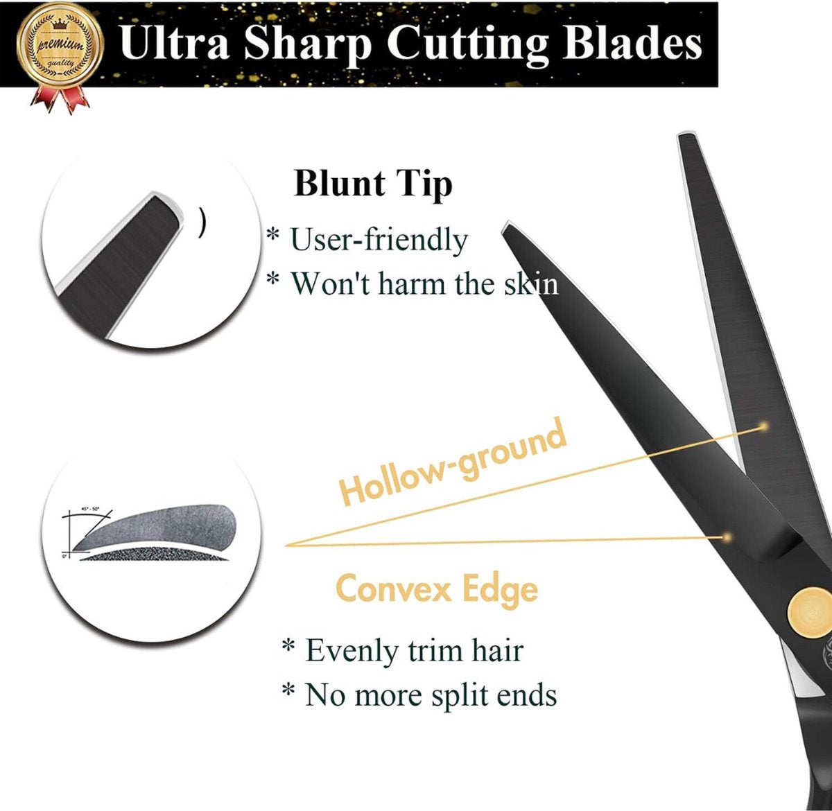 Professionele Kwaliteit voor Iedereen Deze set bevat niet alleen een hoogwaardige kappersschaar, maar ook een slijpschaar, waardoor u de vrijheid hebt om diverse haarstijlen en -texturen te creëren. Perfect voor professioneel salonwerk, maar ook gebruiksvriendelijk genoeg voor thuisgebruik.