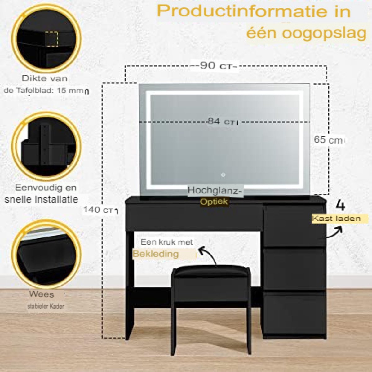 • Eenvoudig in gebruik: de montage van onze LED kaptafel is eenvoudig te installeren dankzij de eenvoudige en duidelijke instructies.
