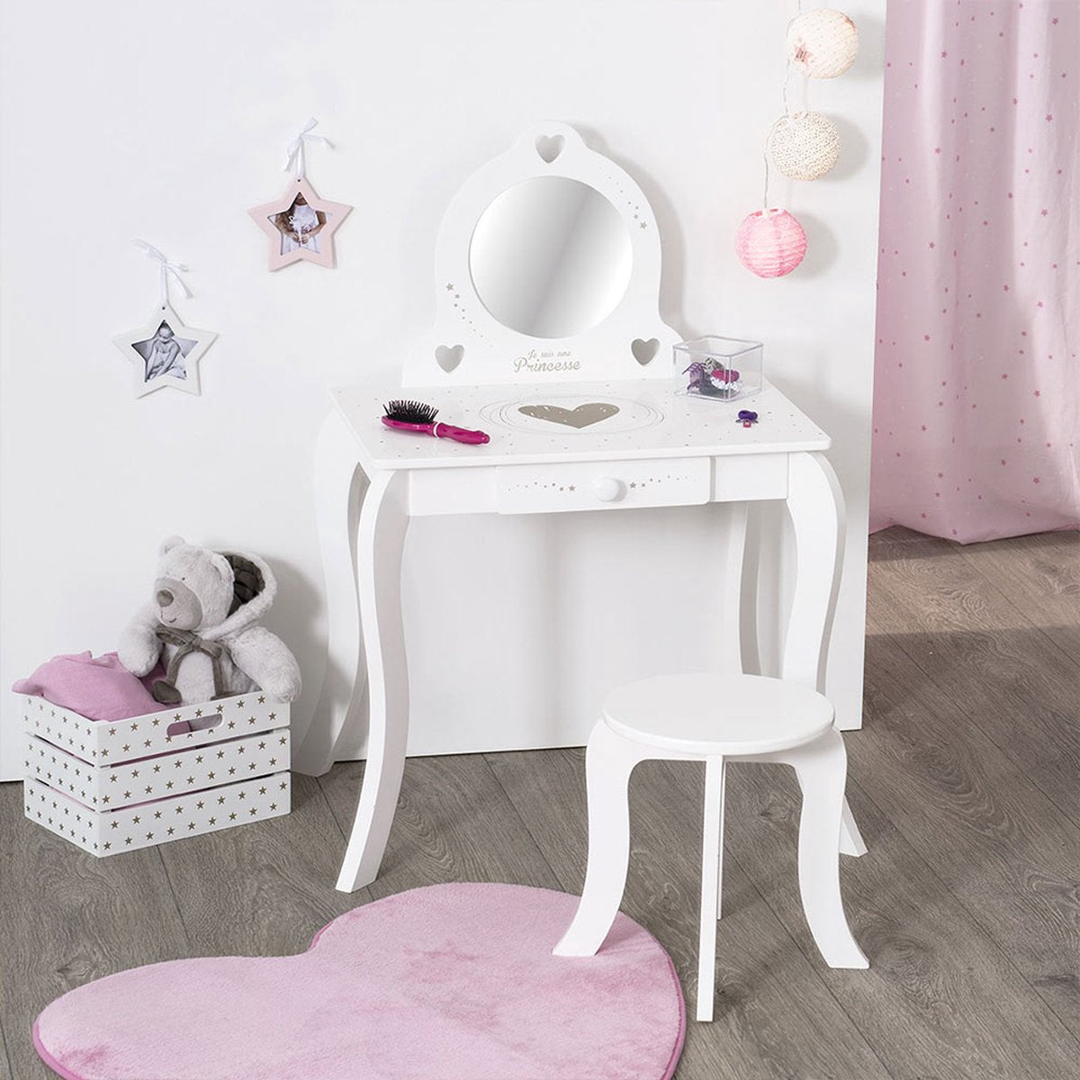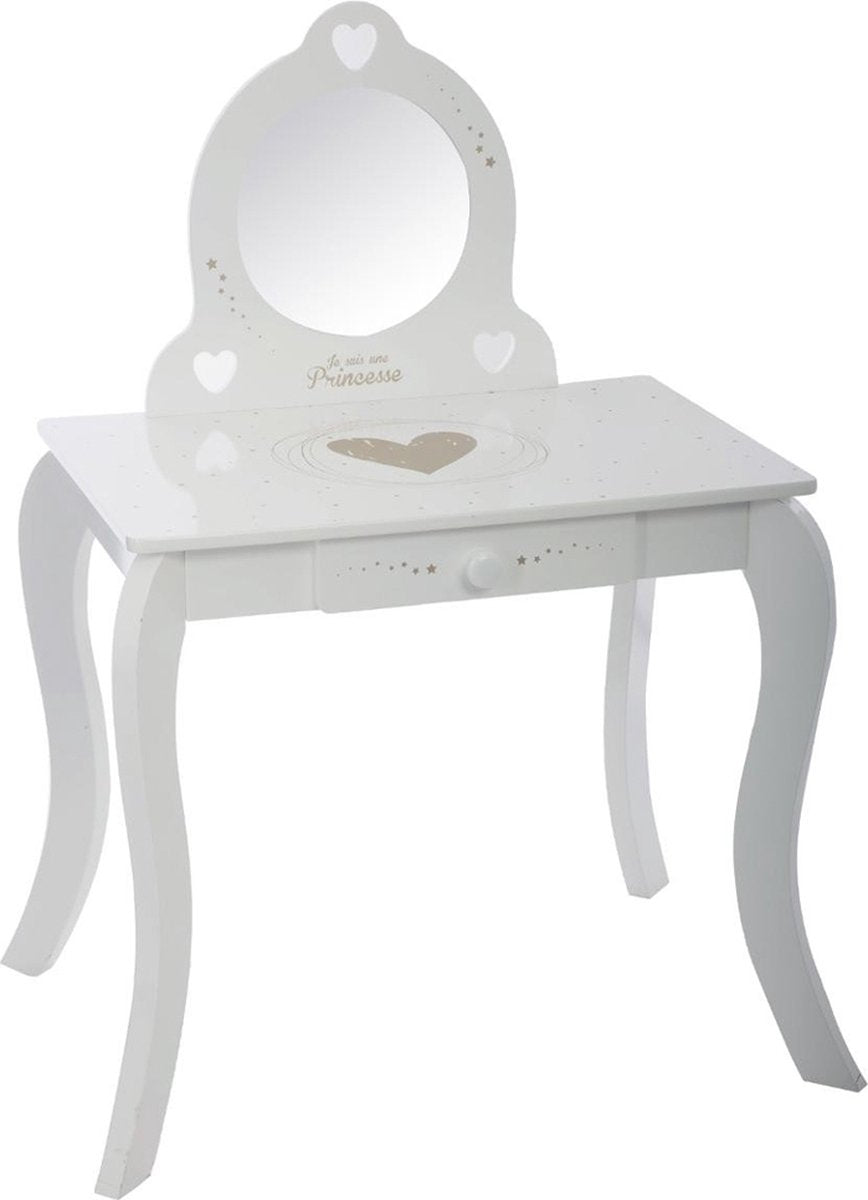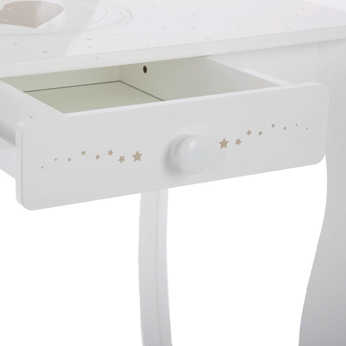 Echte prinsessen kunnen volop spelen aan deze sierlijke kaptafel voor kinderen van Eazy Living. De witte kaptafel heeft een sierlijk design met hartjes en sterren en wordt geleverd met spiegel en krukje. In de lade kunnen kleine spullen zoals pennen, sieraden, geheime briefjes,… opgeborgen worden.