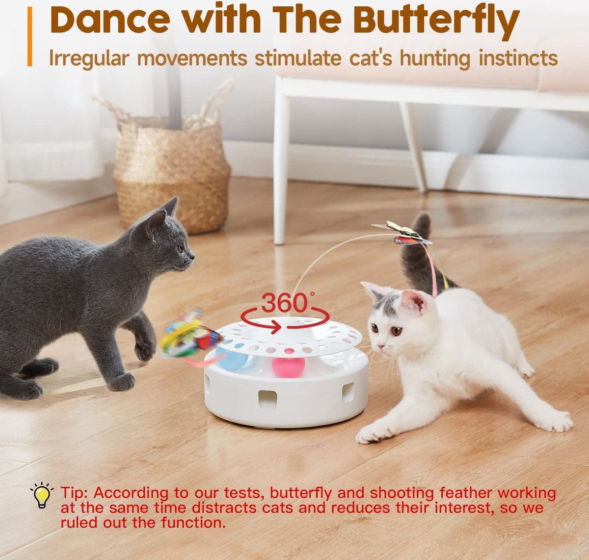 Het Kat Speelgoed 3-In-1 Smart Interactieve Intelligente Kitten Speelgoed is een slim en interactief speeltje voor uw kat. Dit speelgoed bevat drie verschillende speelelementen: een fladderende vlinder, een willekeurig bewegende veer en een beweegbare basis, waardoor uw kat verschillende speelmogelijkheden heeft en veel plezier kan beleven.