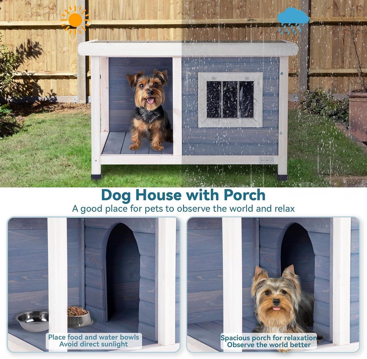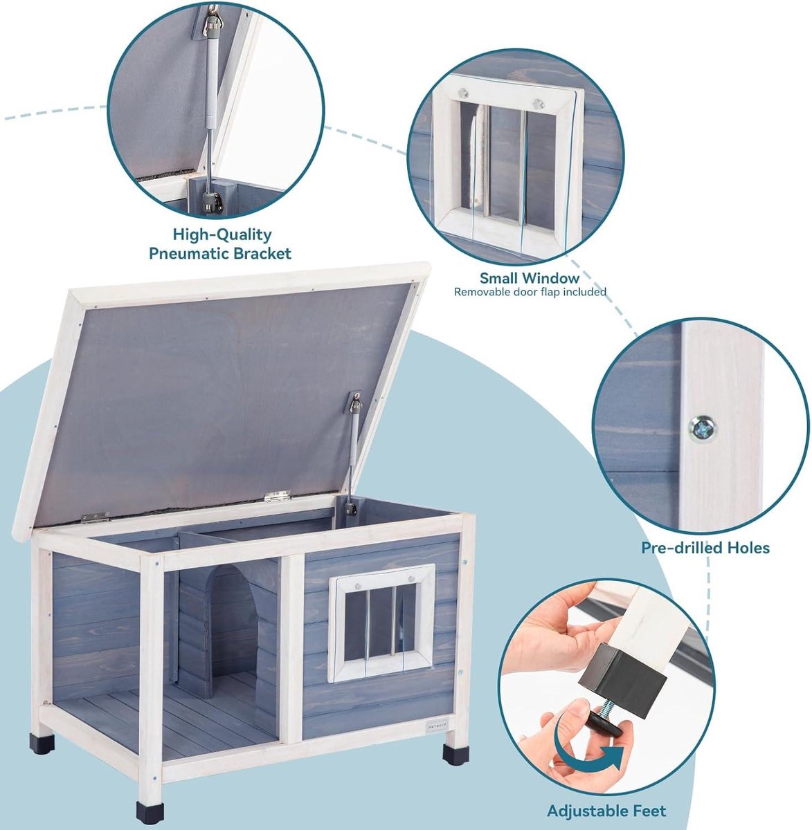 Het kleine hondenhuis is gemaakt van massief hout met roestvrijstalen hardware, waardoor het duurzaam en sterk is voor langdurige bescherming. De afmetingen van het hondenhuis zijn als volgt: Buitenmaat 33 "L x 25" Wx 23"H, Binnenmaat van de woonruimte: 16,5 "L x 18" B x 16"H, Deur Opening 9" B X33" H, Balkon grootte: 12"Lx 18"W. Hierdoor is het outdoor hondenhok geschikt voor kleine hondenrassen.