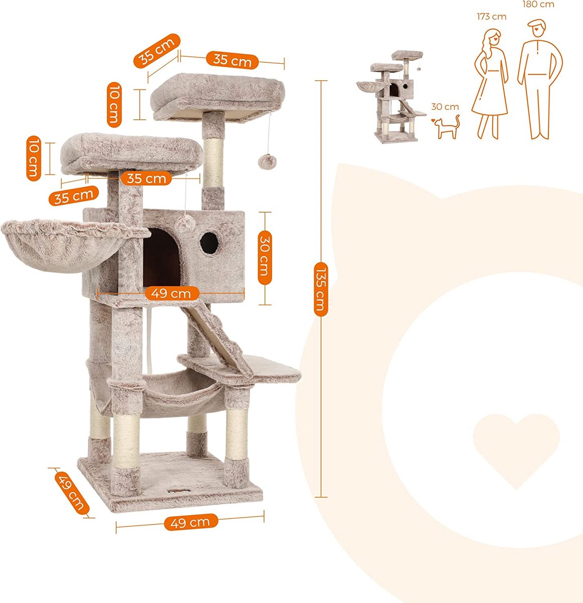 - Comfort is central: This 135 cm high scratching post is covered with 500 g/m² plush material (softer, denser and airier) so that your cat is in good hands here
