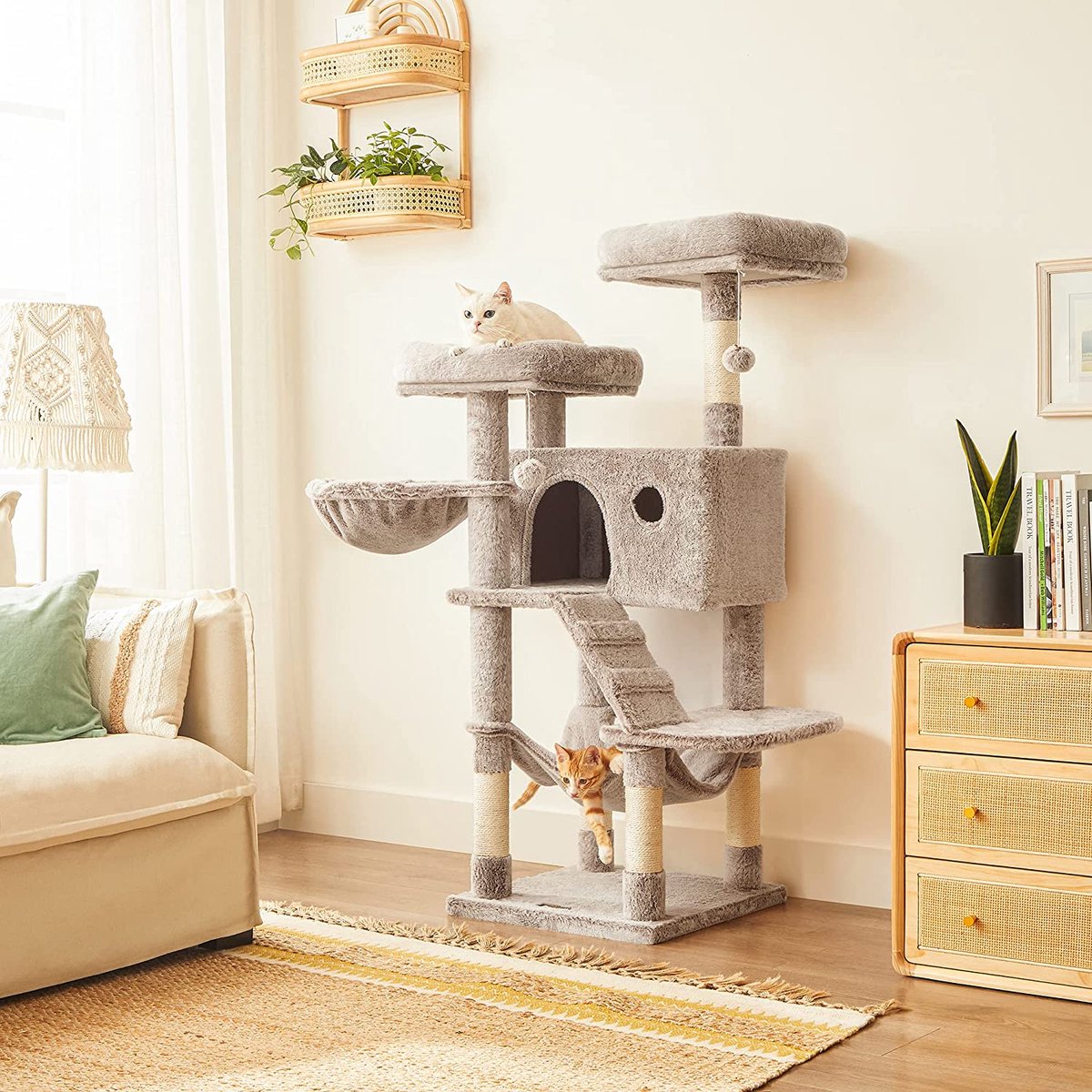 - Climbing, sharpening claws, relaxing: a staircase for easy climbing, sisal trunks to sharpen your claws, a cozy hammock for relaxing; plus a hammock for a nap and 2 well-lined platforms with raised edges. Have fun!