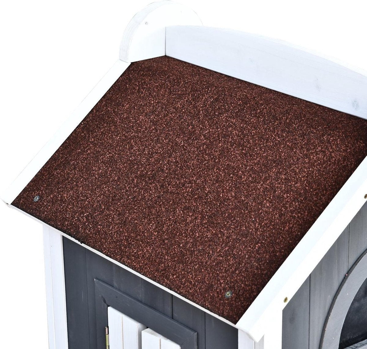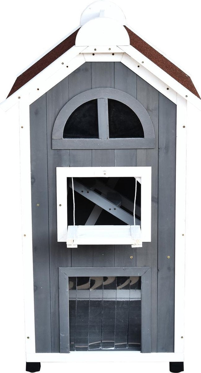 Meerdere ingangen, een raam en een balkon bieden je goede uitkijkpunten, de hangmat binnen nodigt uit om te slapen. Het kattenhuis is gemaakt van massief dennenhout, is voorzien van een asfalt dak en weerbestendige verf. Zo zijn je lievelingen ook beschermd tegen de elementen in de tuin.