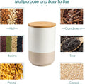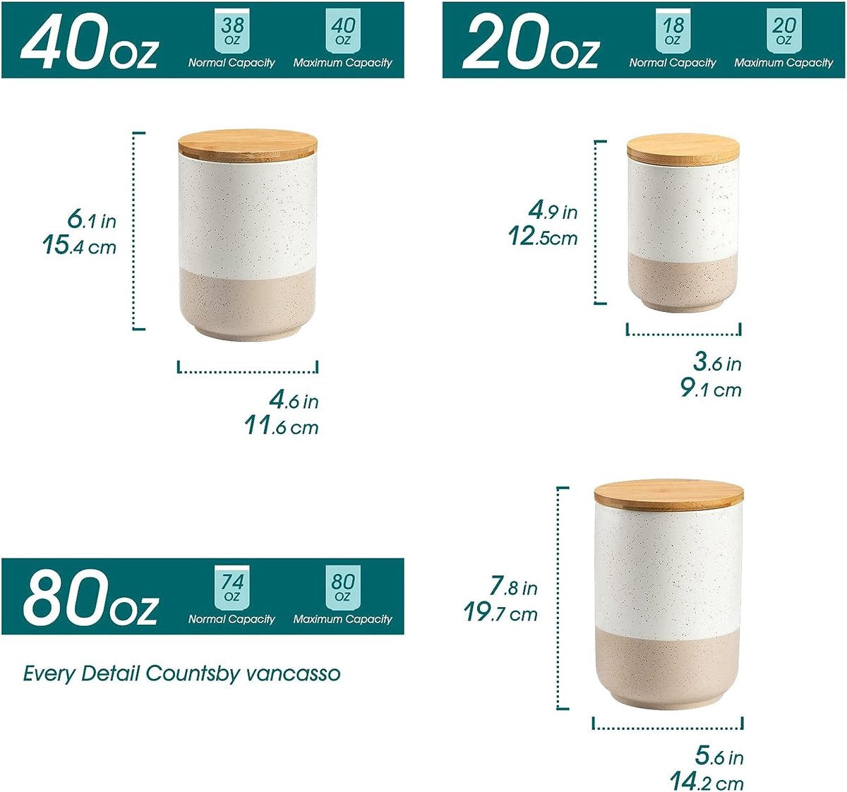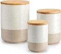 Specificaties en capaciteit】De keramische pot met luchtdicht deksel bevat 3 verschillende maten. De diameter en hoogte zijn 14,2 x H 19,7 cm, 11,6 x H 15,4 cm, 9,1 x H12,5 cm. De inhoud van de beker is 2400 ml/ 1250 ml/ 600 ml. Houd er rekening mee dat door verschillen in dichtheid de capaciteit mogelijk niet het maximale bereikt. 【Blikken met brede hals】 Draai het deksel vast als een schroef om de lucht in de container te laten leeglopen voor een betere afdichting. Dankzij het ontwerp met brede opening kunt u gemakkelijk items inbrengen en verwijderen. Glad glazuur voor eenvoudige reiniging. De keramische jerrycans zijn vaatwasmachinebestendig en de deksels kunnen alleen met de hand worden gewassen. 【Hoogwaardig materiaal】De bussen zijn gemaakt van hoogwaardig terracotta, dat niet gemakkelijk te kraken en te vormen is en duurzamer is dan plastic en glas. Het deksel is gemaakt van bamboehout, met een milieuvriendelijke rubberen afdichtingsring om de afdichting te verbeteren. Houdt voorwerpen effectief droog en fris. 【Praktisch】Deze jerrycanset is geschikt voor het bewaren van de meeste ingrediënten zoals koffie, meel, suiker, thee, kruiden, pasta, koekjes, noten, ontbijtgranen, enz. Het kan ook worden gebruikt als jerrycan voor opslag in de badkamer, en jij kan het voor vele doeleinden gebruiken. De strakke en eenvoudige uitstraling geeft je kamer een modern tintje, maar ook als keukendecoratie. De spikkels op de glazen zijn een uniek vancasso-ontwerp.