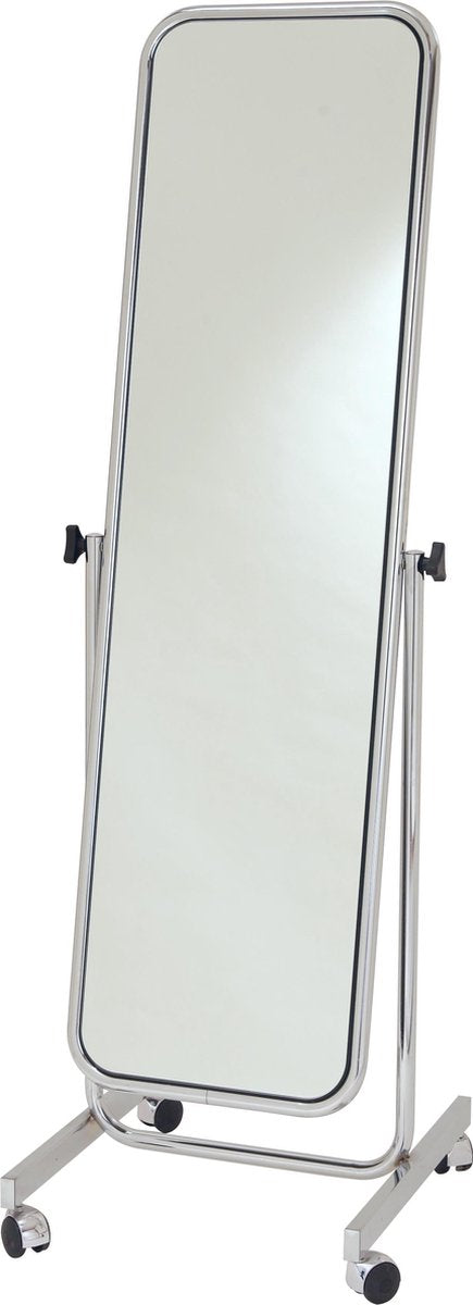 Professionele passpiegel welke ideaal is voor gebruik thuis, in uw winkel of voor uw marktkraam. Door de zeer degelijke constructie is deze passpiegel ijzersterk en gaat jarenlang mee. De passpiegel is met twee verstelschroevenaan aan een metalen H-standaard bevestigd en daardoor horizontaal kantelbaar. De H-standaard is uitgevoerd met dubbele kunststof wielen.