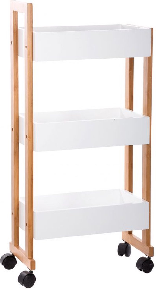 Dit badkamerrek/keukenrek is voorzien van 3 grote vakken en een handgreep. Afmetingen: breedte 20 cm, hoogte 80 cm en diepte 38 cm. Het is gemaakt van bamboe en is voorzien van 4 wielen zodat hij makkelijk verplaatst kan worden. Daarom wordt het ook wel een serveerwagen genoemd of butler.
