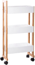 Dit badkamerrek/keukenrek is voorzien van 3 grote vakken en een handgreep. Afmetingen: breedte 20 cm, hoogte 80 cm en diepte 38 cm. Het is gemaakt van bamboe en is voorzien van 4 wielen zodat hij makkelijk verplaatst kan worden. Daarom wordt het ook wel een serveerwagen genoemd of butler.