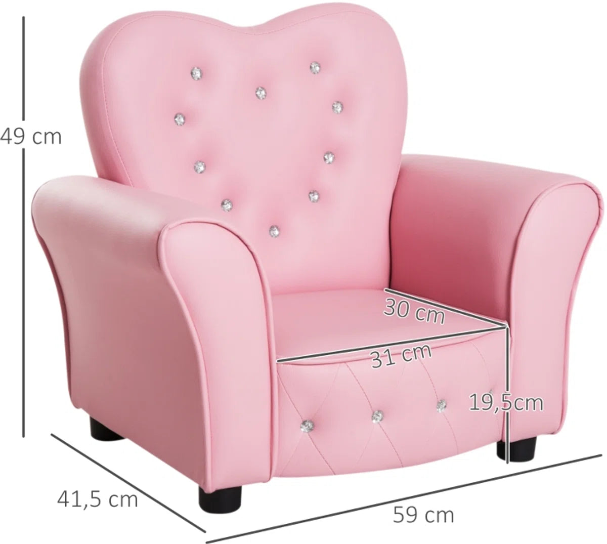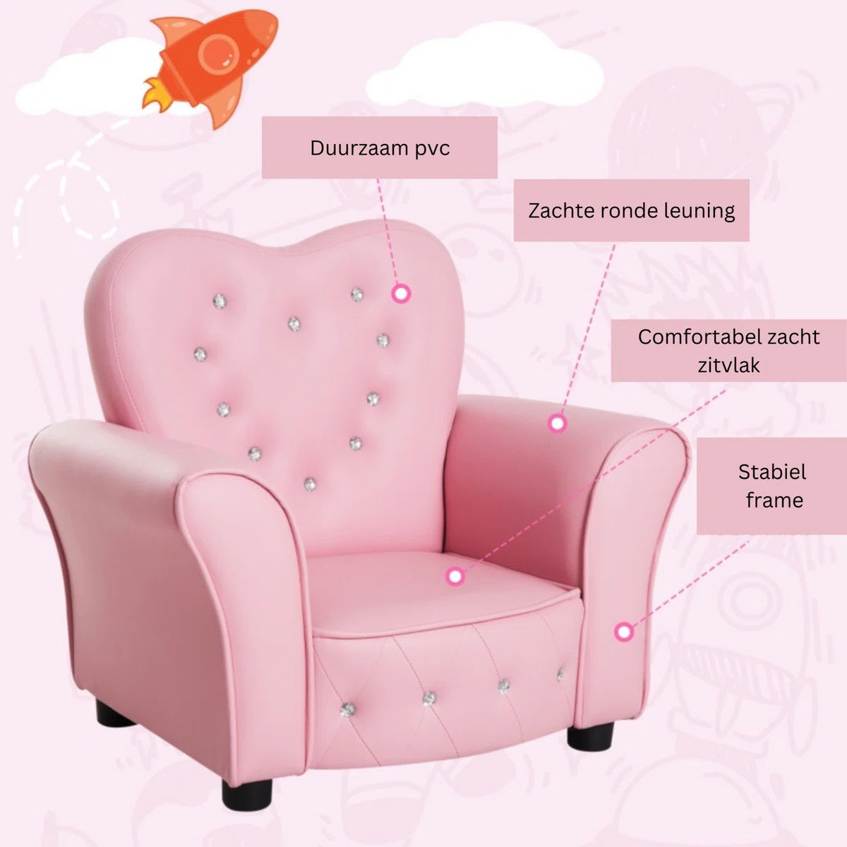 Voel je als een echte prinses met deze prachtige kinderstoel! Met zijn hartvormig ontwerp en betoverende kristallen studs is deze roze kinderzetel een absolute eyecatcher. De kindersofa is gemaakt van hoogwaardig en comfortabel gevoerd materiaal en zorgt voor urenlang speelplezier. Ideaal voor de kinderkamer, speelkamer en woonkamer! En schoonmaken is een fluitje van een cent. Bestel nu jouw eigen koninklijke kinderbankje en geef elk meisje het perfecte cadeau. Geschikt voor kinderen van 1,5 tot 3 jaar met een maximaal draagvermogen van 45 kg.