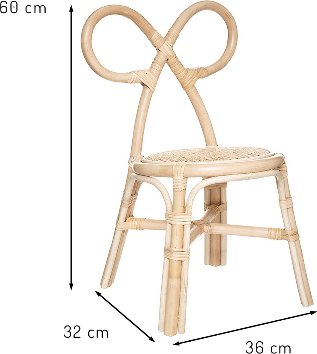 Leuk stoeltje voor kinderen gemaakt uit rotan met rieten zitting. Afmetingen 36 x 32 x 60 cm