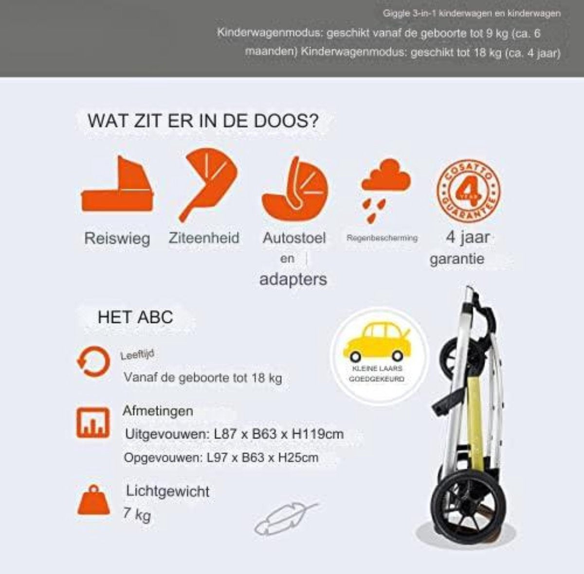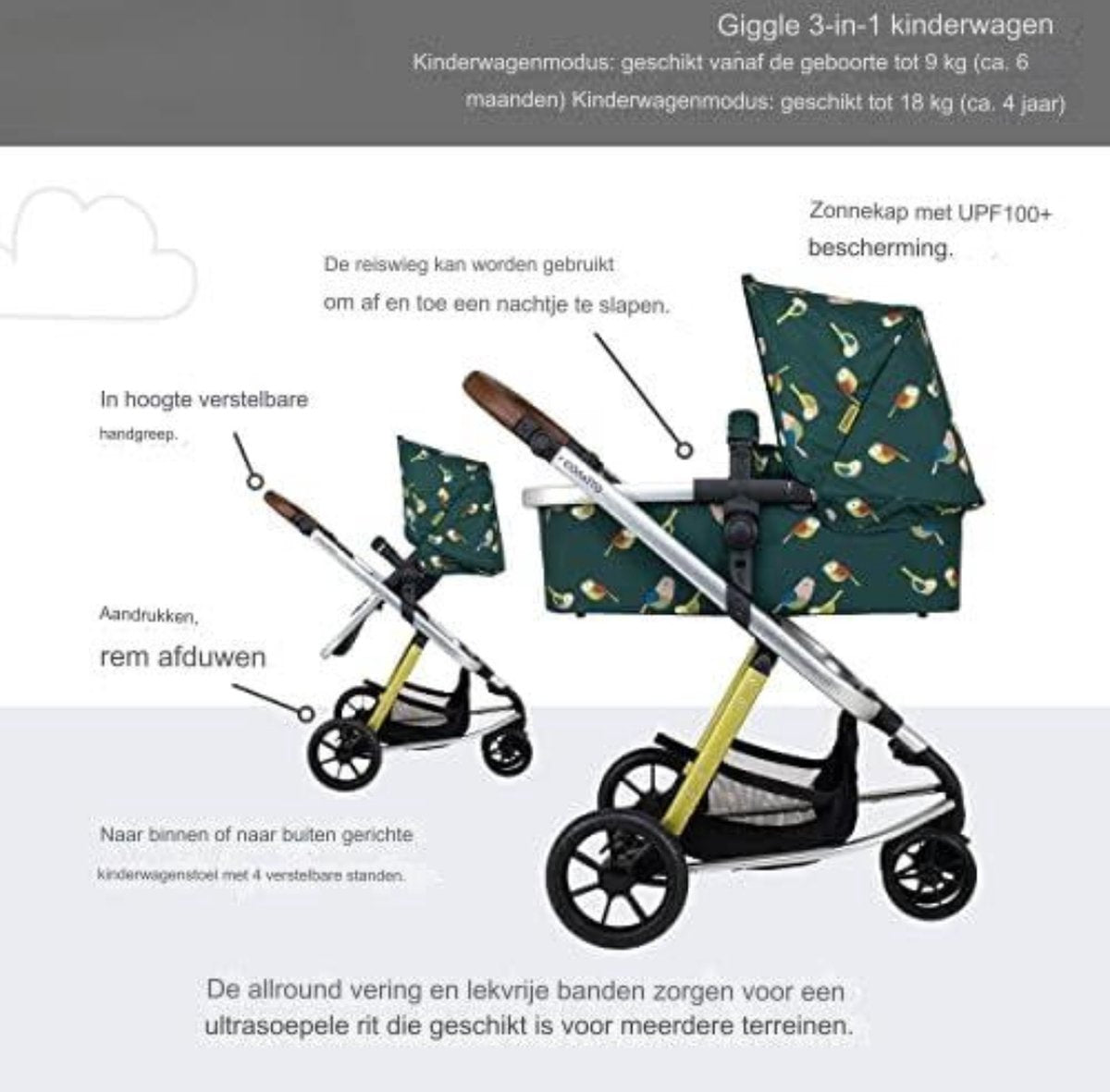 Zonnekap met beschermingsfactor UPF100+ Geschikt voor een ultragladde rit op diverse terreinen Compact inklapbaar, lichtgewicht chassis van 7 kg Het slanke ontwerp met drie wielen helpt bij het manoeuvreren in krappe ruimtes Ideaal voor drukke gezinslevens
