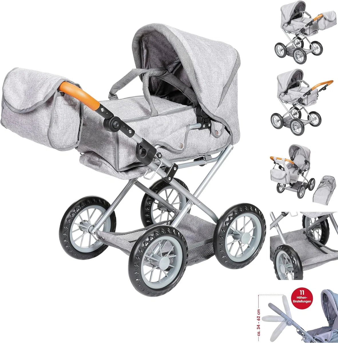 - Een in hoogte verstelbare schuiver met zachte coating (ca. 34-62 cm) maakt het mogelijk om de auto met de poppenmoeder te laten groeien