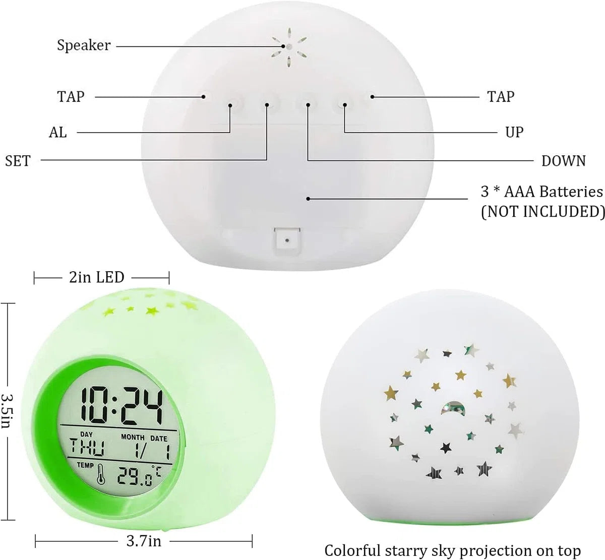 De sluimerfunctie wordt begeleid door natuurlijke, zachte muziek, zodat je kinderen zachtjes worden gewekt, terwijl de slaaptrainingsfunctie hen leert wanneer het tijd is om naar bed te gaan en wanneer het tijd is om op te staan. Deze wekker werkt op 3 AAA-batterijen (niet inbegrepen), waardoor hij gemakkelijk te plaatsen en te gebruiken is in elke ruimte.