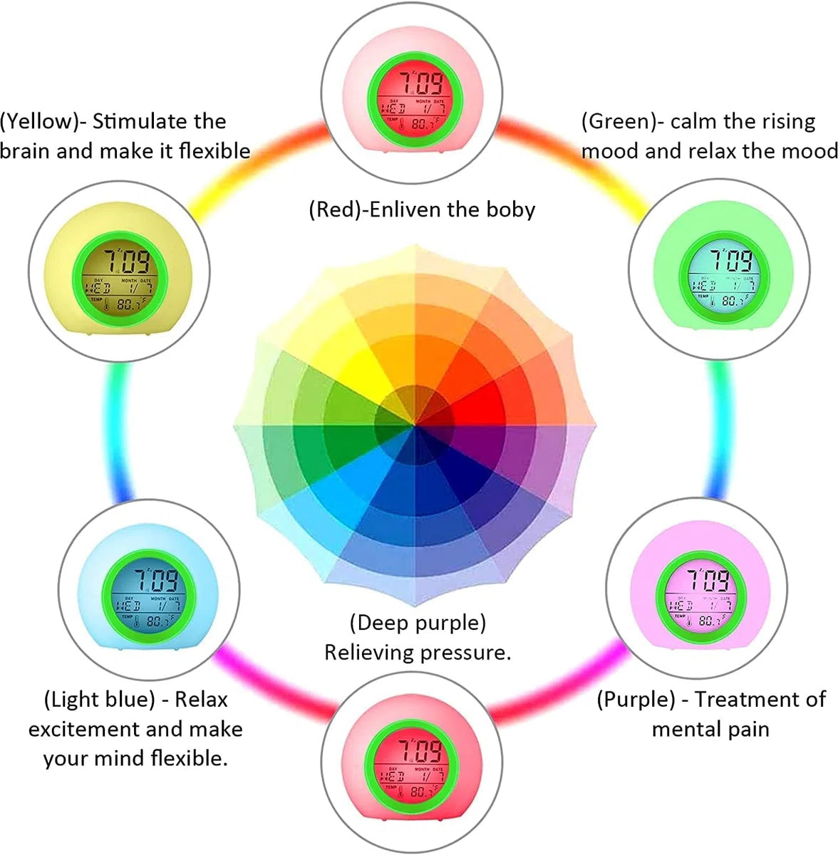 Maar wat deze wekker echt onderscheidt, is de betoverende sterrenprojectie in combinatie met zachte muziek, die 's nachts in zeven kleuren oplicht. Deze functie creëert niet alleen een plezierige en romantische sfeer maar helpt ook bij het bevorderen van een rustgevende slaapomgeving voor jou en je kinderen.