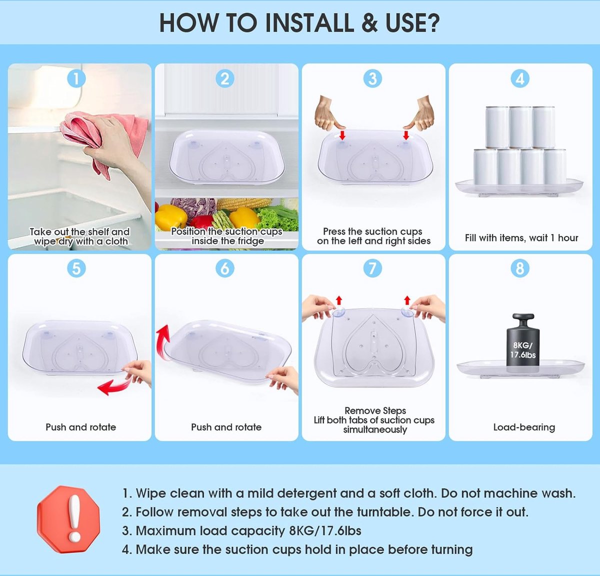 Efficiënt gebruik van ruimte: onze rechthoekige Lazy Susan draaiplateau organizer past beter in koelkasten dan ronde draaiplateaus en gebruikt de ruimte effectiever om ongebruikte "dode ruimte" te voorkomen. Met afmetingen van 40 x 30 x 3 cm biedt het functionaliteit zonder in de weg te zitten. Zachte 360° rotatie: gewoon uittrekken en de Lazy Susan voor de kast draaien. Alles wat achter is vergeten, is direct voor je ogen, zonder dat je moeizaam glazen en flessen hoeft te bewegen. Zo voorkom je voedselverspilling en bespaar je geld. Stabiel en gemakkelijk te reinigen: de zuignappen houden de heldere ABS-draaischijf op tafel stabiel. Hij is gemakkelijk afneembaar en met een doek en milde reinigingsmiddelen gemakkelijk te reinigen. Let op: niet vaatwasmachinebestendig. Eenvoudige montage: onze nieuwste koelkastorganizer kan in enkele seconden en zonder gereedschap worden geïnstalleerd. Met behulp van de bijgevoegde zuignappen en handleiding is hij snel en eenvoudig op het oppervlak bevestigd. Deze kunststof organizer is robuust en duurzaam. Veelzijdig inzetbaar: dit is niet alleen een kruidendraaischijf, maar kan ook als make-up-organizer of voor dranken en snacks worden gebruikt. Perfect voor badkamer, slaapkamer, kantoor of overal waar je extra orde nodig hebt. Tip: Geschikt voor gladde oppervlakken zoals hout, glas, tegels en marmer. Houd er rekening mee dat de zuignappen op andere oppervlakken mogelijk niet hechten.
