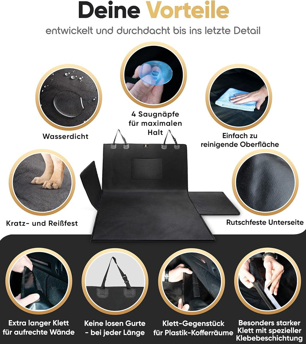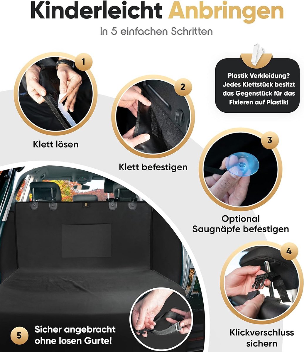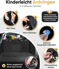 ** Supersnelle Installatie en Verwijdering**: In slechts enkele stappen is de kofferbakbescherming veilig te bevestigen en te verwijderen. Met 2 kliksluitingen op de hoofdsteunen en 4 klittenbandsluitingen voor de zijkanten is montage een fluitje van een cent.