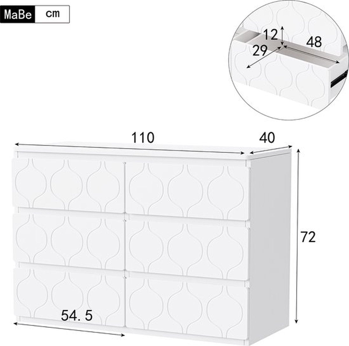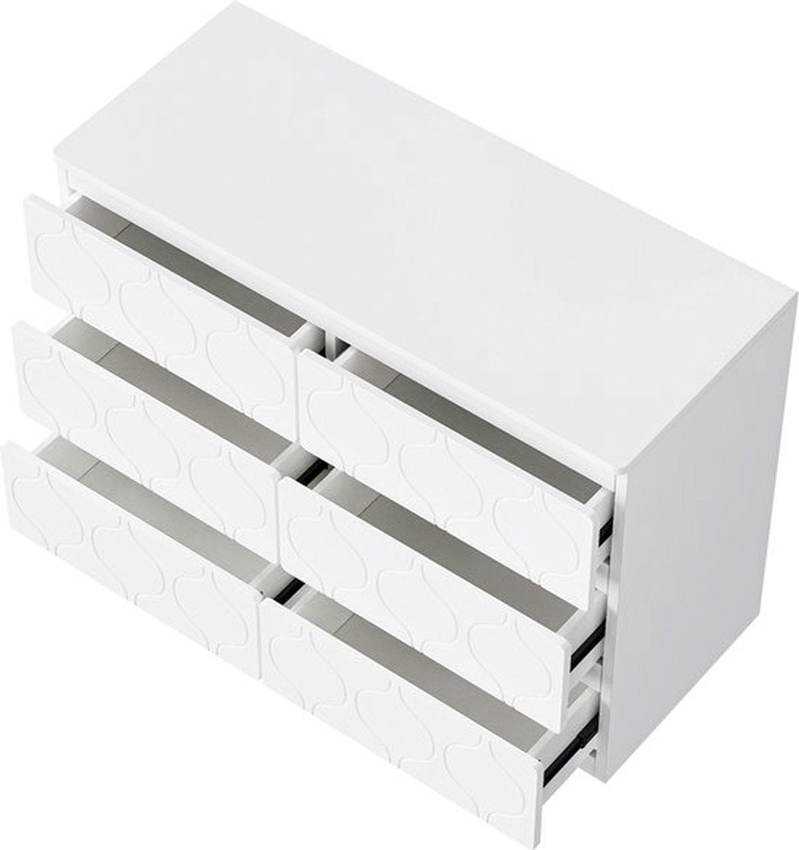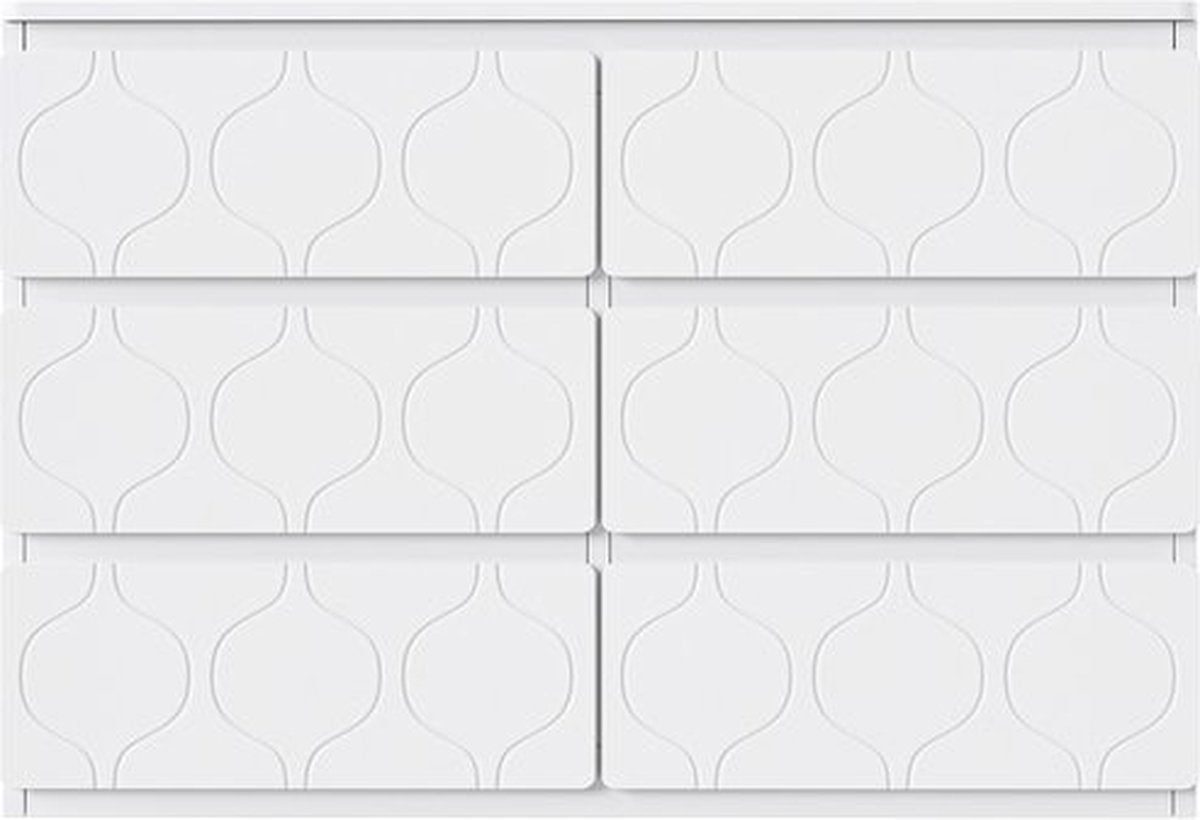 Kommode met 6-laden, hal kast, voor woonkamer, badkamer en slaapkamer, golfpatroon, gelakt, slagvast hoekontwerp, 6-compartimenten, 110 B x 40 T x 72 H, wit