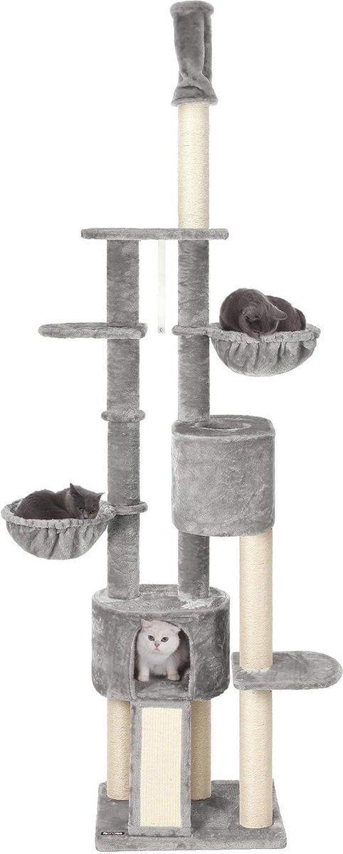 VAN DE VLOER NAAR HET PLAFOND: Deze krabpaal maakt optimaal gebruik van de verticale ruimte om een klimparadijs te creëren. Verhuizen naar een nieuw huis? Maak je geen zorgen! Met een verstelbare paal aan de bovenzijde past hij op plafonds van 2,4 tot 2,6 meter hoog