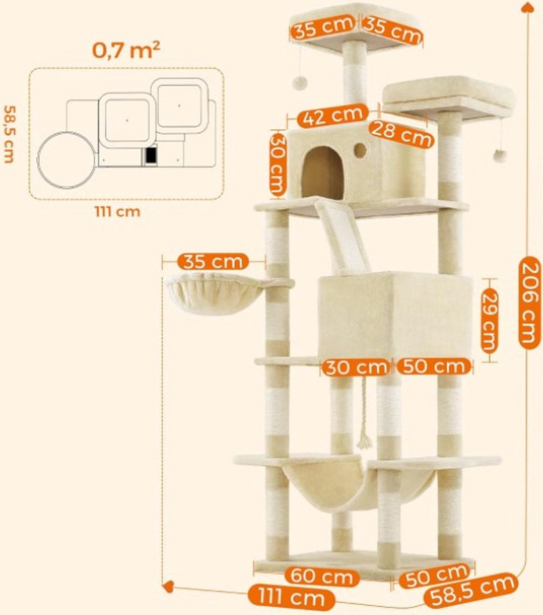 Deze Krabpaal is een indrukwekkende 206 cm hoge kattenboom ontworpen voor avontuurlijke katten van alle leeftijden. Met 5 niveaus en korte afstanden tussen de treden van 30-40 cm, biedt deze krabpaal niet alleen een uitdagende klimervaring voor actieve katten, maar is ook vriendelijk voor kittens en oudere katten. De krabpaal is uitgerust met 2 goed gevoerde zitplatforms, 2 gezellige kattenholen, 1 pluizige mand, 2 pom-poms en 1 hangmat met een speeltouw erboven, waardoor het een ware all-in-one speeltuin is voor jouw harige vrienden.