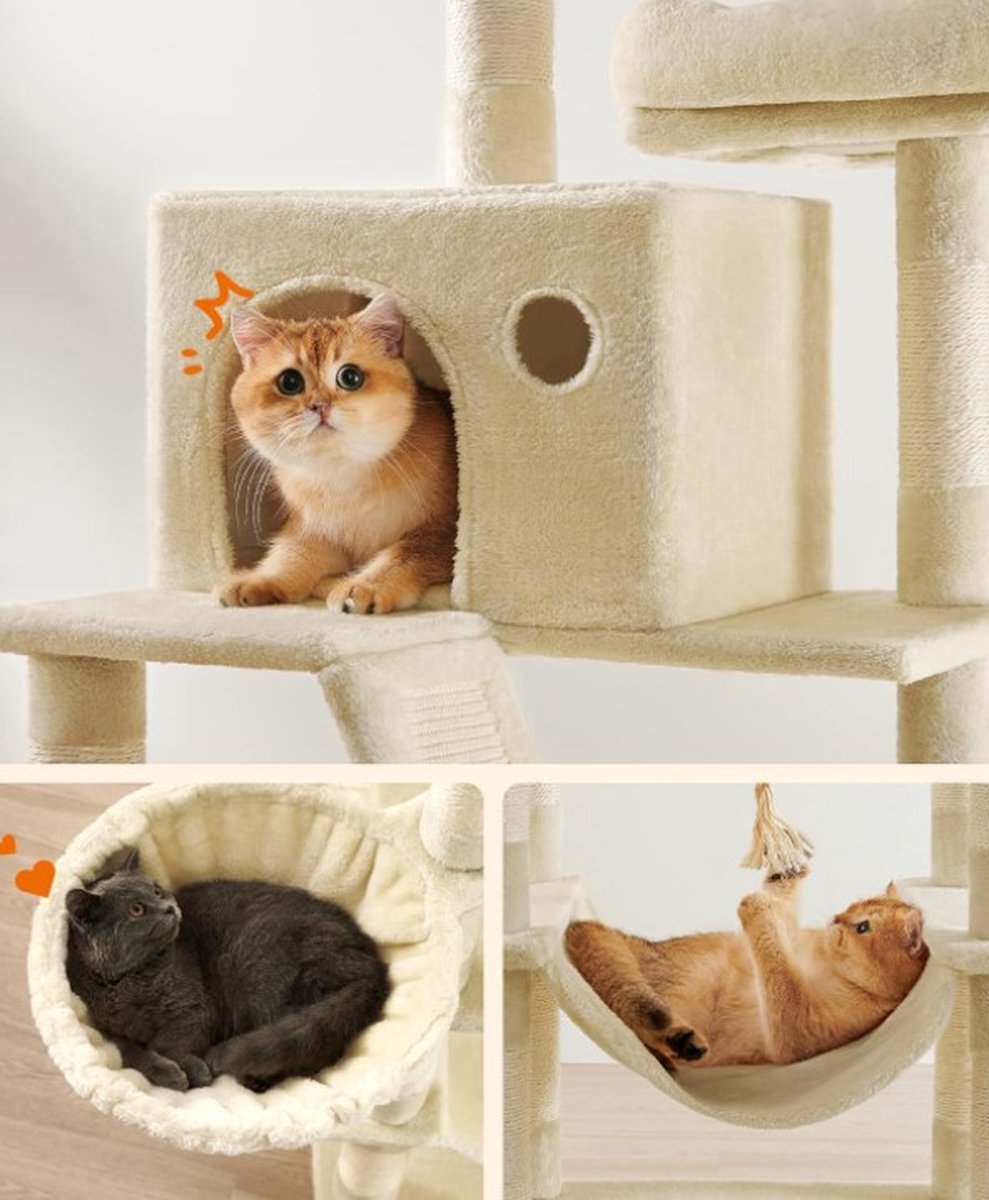 2. All-in-One Playground: De diverse elementen zoals zitplatforms, kattenholen, mand, pom-poms en hangmat zorgen voor comfort en vermaak, waardoor het een favoriete plek wordt voor jouw katten.