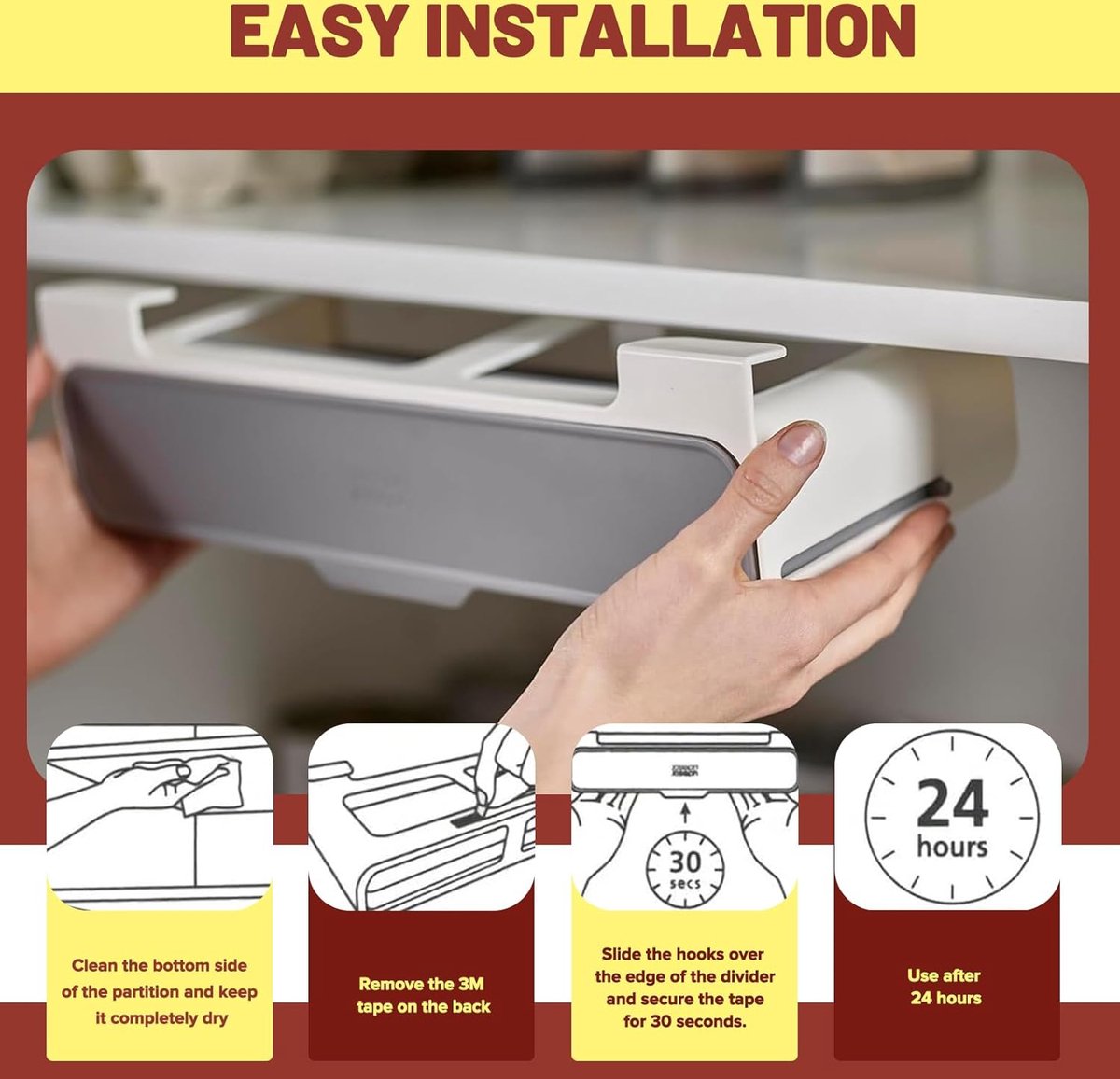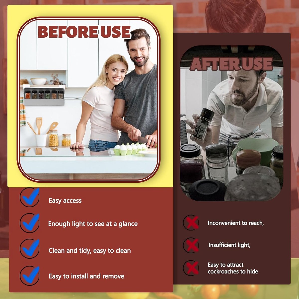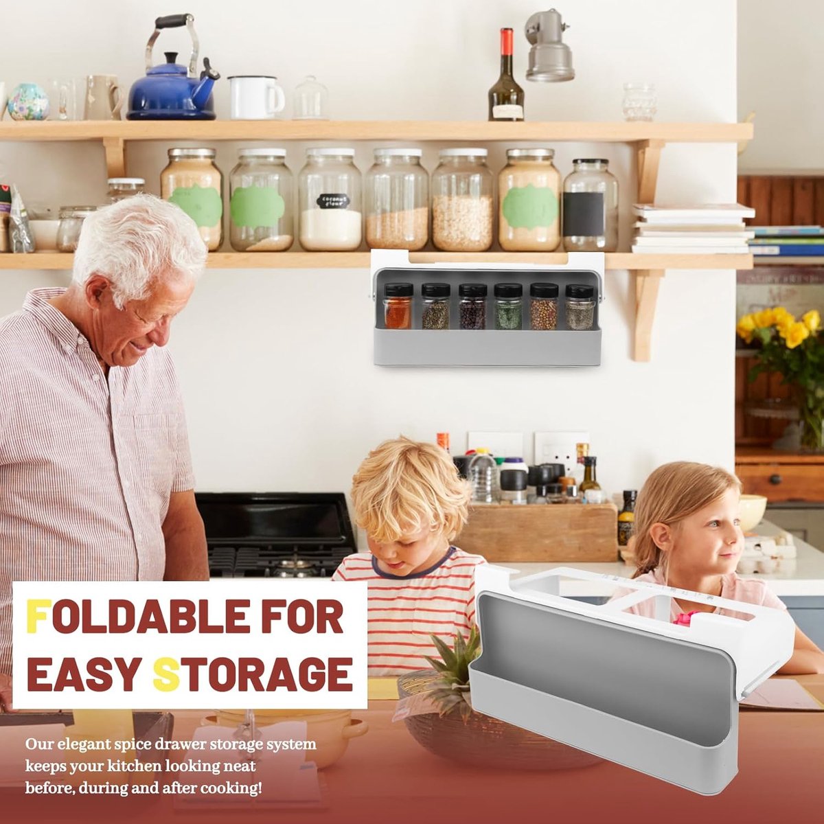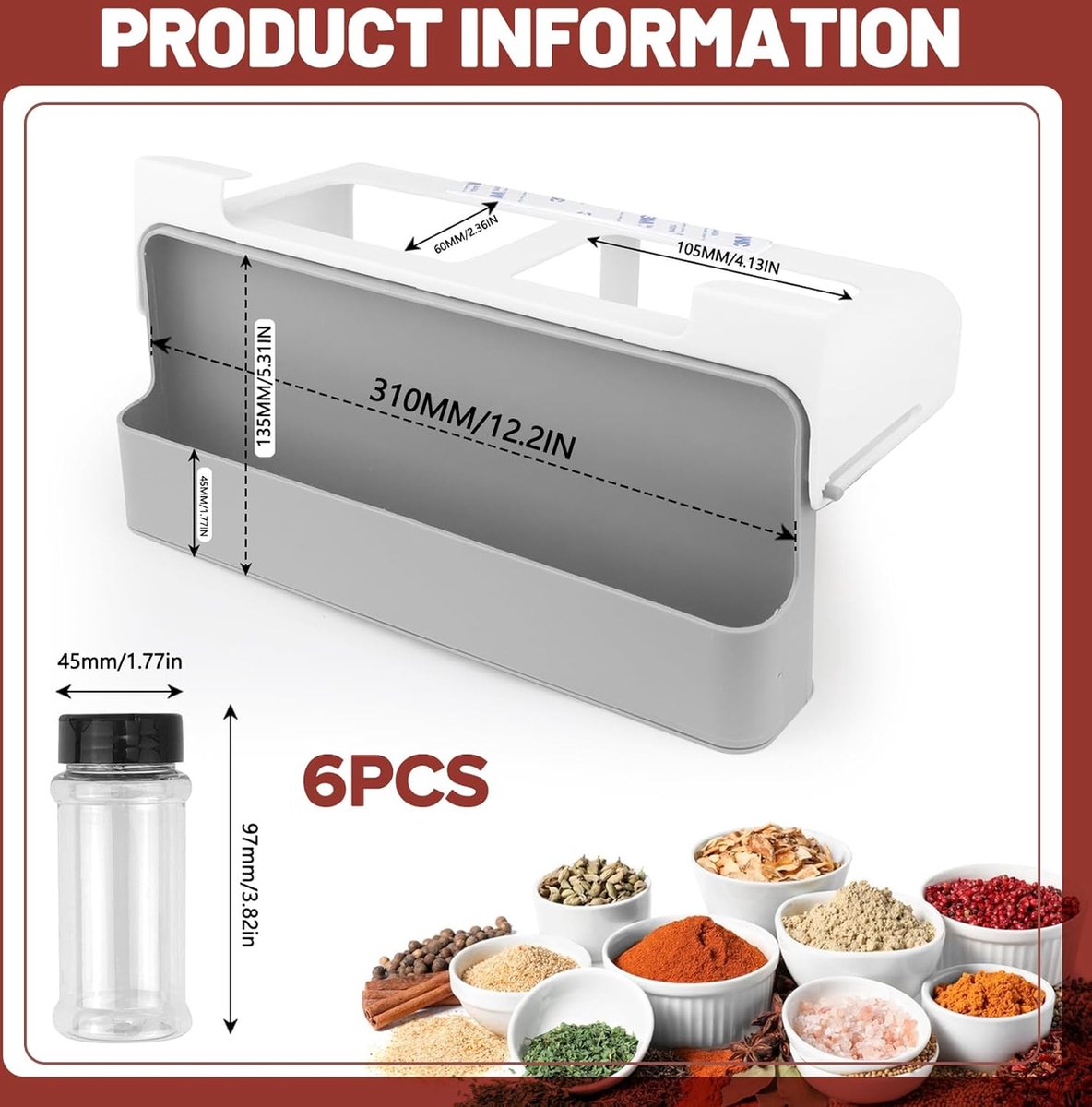 Hoogwaardige materialen: ons kruidenrek om op te hangen is gemaakt van hoogwaardig pvc-materiaal, vrij van schadelijke stoffen, slijtvast, corrosiebestendig, verdikt materiaal, maakt het duurzamer en niet gemakkelijk te breken. Kruidenreksysteem is niet zo zwaar als een metalen rek en heeft geen scherpe hoeken, dus maak je geen zorgen om je laden te beschadigen. Installatie zonder boren: geniet van de probleemloze installatie met een slimme kruidenorganizer-lade, die eenvoudig aan scheidingswanden van de kast hangt, wordt geleverd met sterke niet-afgevende lijm, zonder dat boren nodig is. Kruidenorganizer kast kinderlijk eenvoudig met dubbele bevestigingen en 3M-plakstrip, duurzaam op te hangen, zelfs bij hoge gewichten. Wordt geleverd met 6 kruidenpotjes: dit praktische kruidenrek wordt geleverd met zes kruidenpotjes, beschikt over een slim uittrekbaar vak, biedt een complete oplossing voor het organiseren en bewaren van een groot aantal specerijen in je keuken. Keukenorganizer afmetingen: 31 x 6,5 x 13,5 cm / 12,2 x 2,56 x 5,31 inch, kruidenpotjes: 9,7 x 4,5 x 4,5 cm / 3,82 x 1,77 x 1,77 inch. Eenvoudig te reinigen: het kruidenrek om te plakken is gemakkelijk met water te reinigen, maar niet vaatwasmachinebestendig. Als het vuil is, veeg het dan gewoon af met een vochtige doek en ziet het er altijd als nieuw uit. Het is duidelijk waterdicht. Het kruidenrek bespaart tijd en moeite en houdt je keukenkast altijd schoon, je keuken mooi en georganiseerd. Keukenorganizer voor specerijen: optimaliseer de organisatie van je keukenruimte door dit rek als kruidenrek te gebruiken, het houdt je specerijen netjes geordend. Onze Spices Organizer ruimt de specerijen op en laat de laden, kasten en het werkblad vrij voor andere doeleinden en maakt gebruik van de ongebruikte ruimte in de kasten.