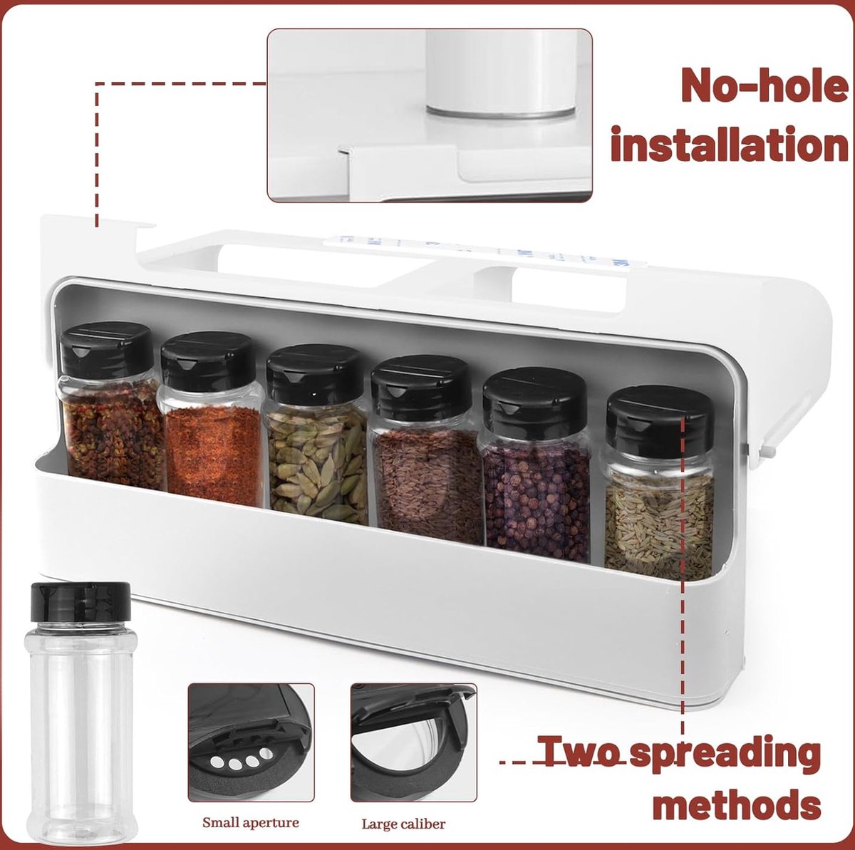 Kruidenpotjes, kruidenorganizer, kruidenrek, set lade, uittrekbaar, met 6 kruidenpotjes, leeg kruidenrek om op te hangen, te plakken, keukenaccessoires, rek, kruidenrek, kruidenhouder, kast,