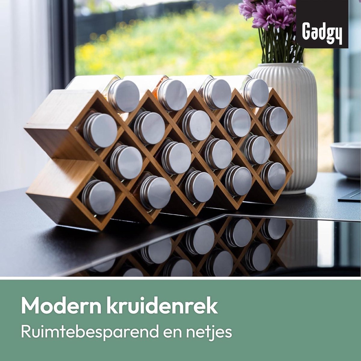 Kruidenpotjes met Stickers - Gadgy Kruidenrek Staand - Glazen Potjes met Deksel - Kruidenrekje Bamboe - Set inclusief Rekje - Kruidenstrooier - Stickers - Strooideksel - Stift Kruidenpotjes met Stickers