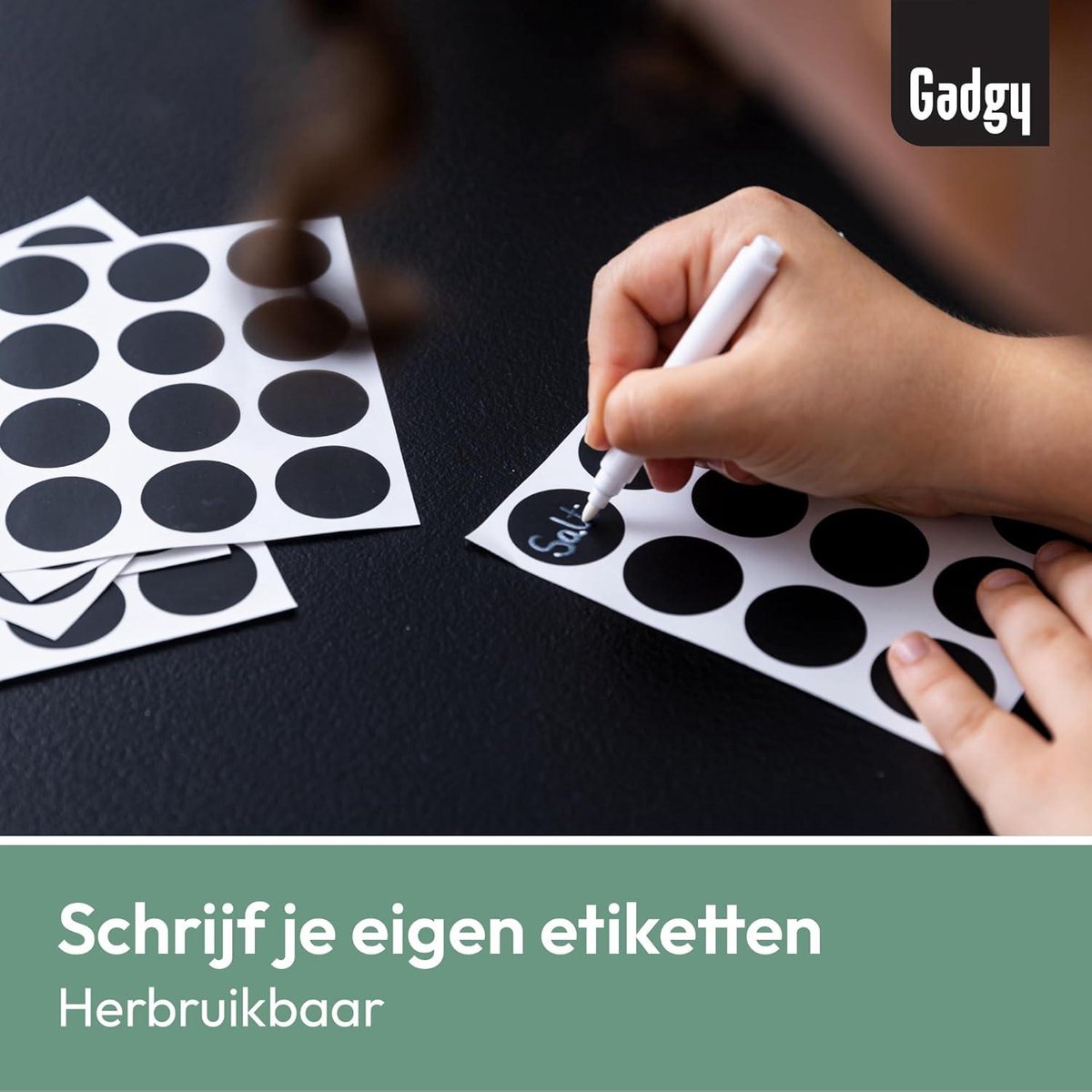 Met de 24 zwarte stickers en de witte stift kun je jouw eigen labels maken voor de kruidenpotjes. De stickers zijn herbruikbaar doordat je de tekst eenvoudig wegveegt met een vochtige doek, zo blijf je flexibel in het organiseren van jouw kruiden.