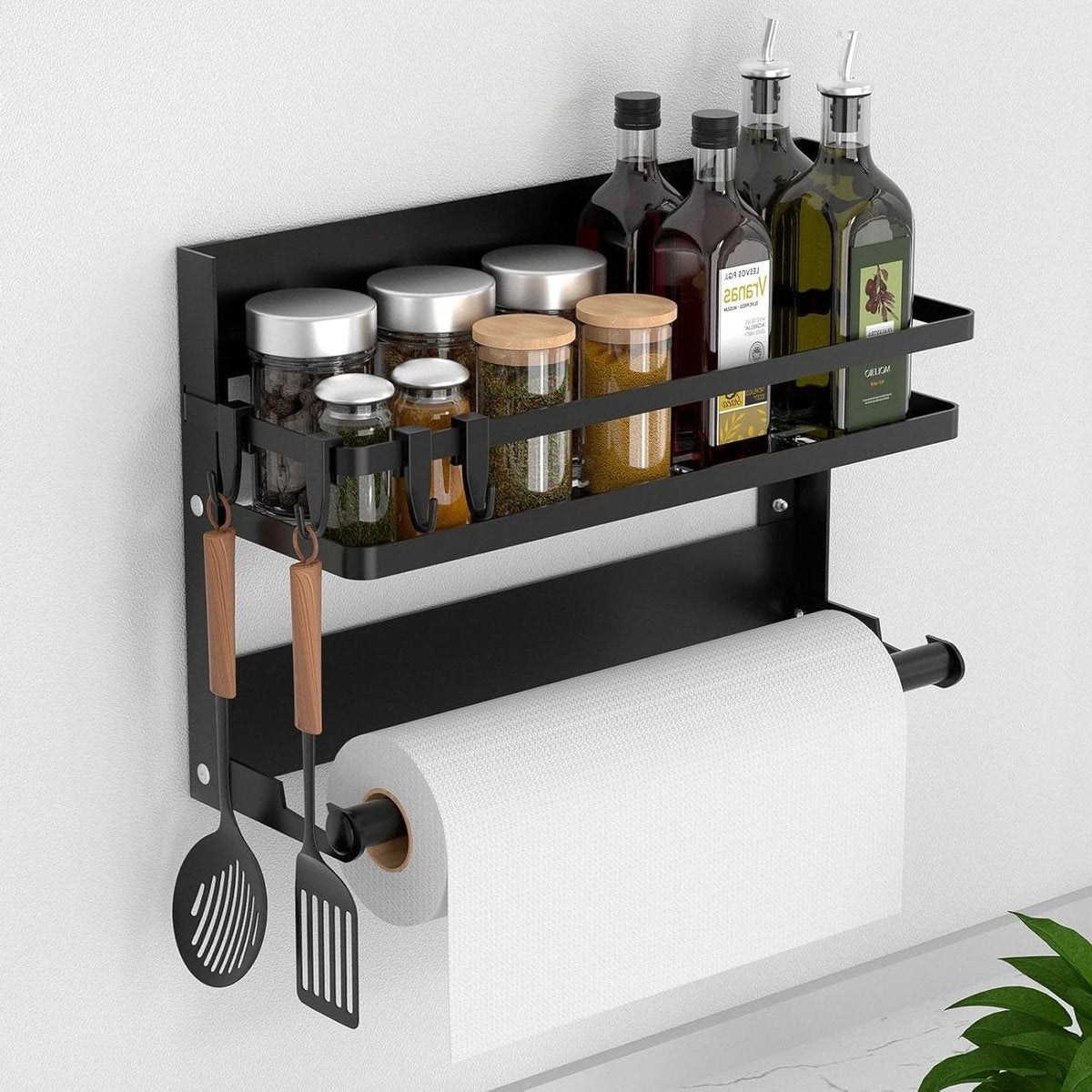 Kruidenrek - Hangend Keukenrek van Roestvrij Staal - Zonder Boren - Zwart - 4 Haken keukenrolhouder hangende