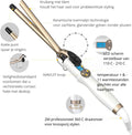 Deze krultang is uitgerust met keramiek met toermalijn, wat zorgt voor gelijkmatige warmteverdeling en bescherming tegen hitteschade. Toermalijn geeft ook ionen vrij en ver-infrarode warmte, waardoor je haar glad wordt en zijn natuurlijke vocht behoudt. Het resultaat? Een zachte, glanzende look in een handomdraai.