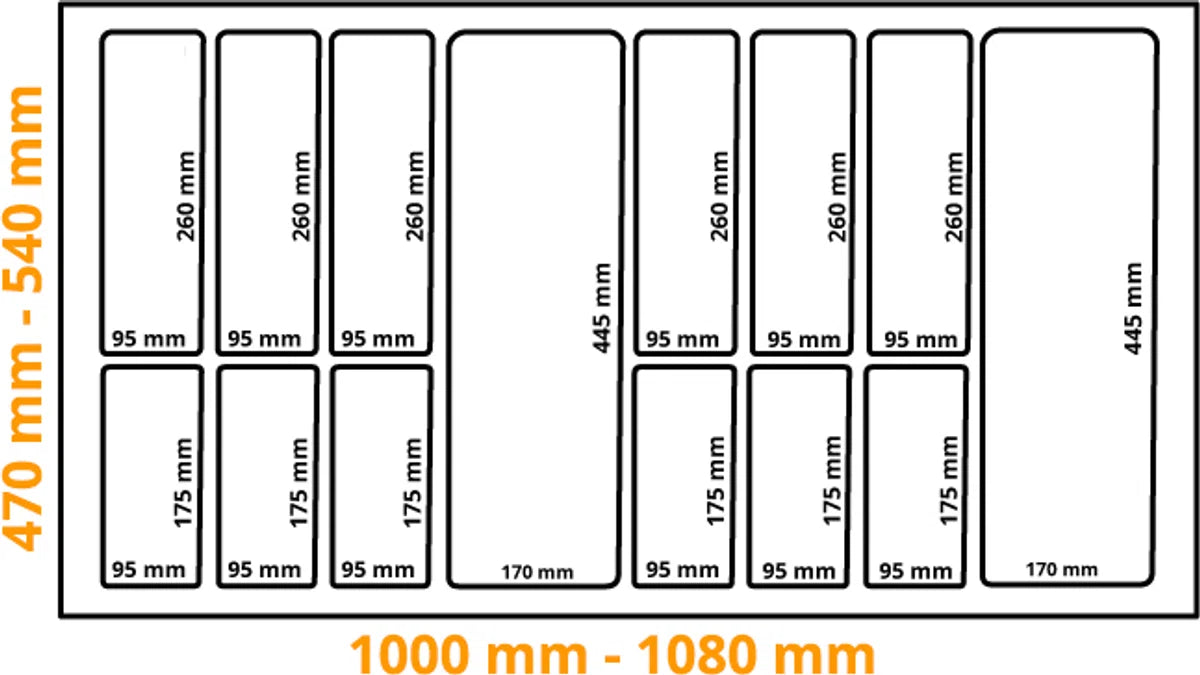 Met behulp van een hobby- of stanleymes kunt u de bestekbakken eenvoudig op maat snijden In de breedte is de bestekbak aan te passen van 100 cm tot 108 cm. De diepte van de bestekbak is aan te passen van 47 cm tot 54 cm. Dit kunt u doen door de bestekbak eerst een paar keer in te snijden om vervolgens het overbodige deel af te breken.