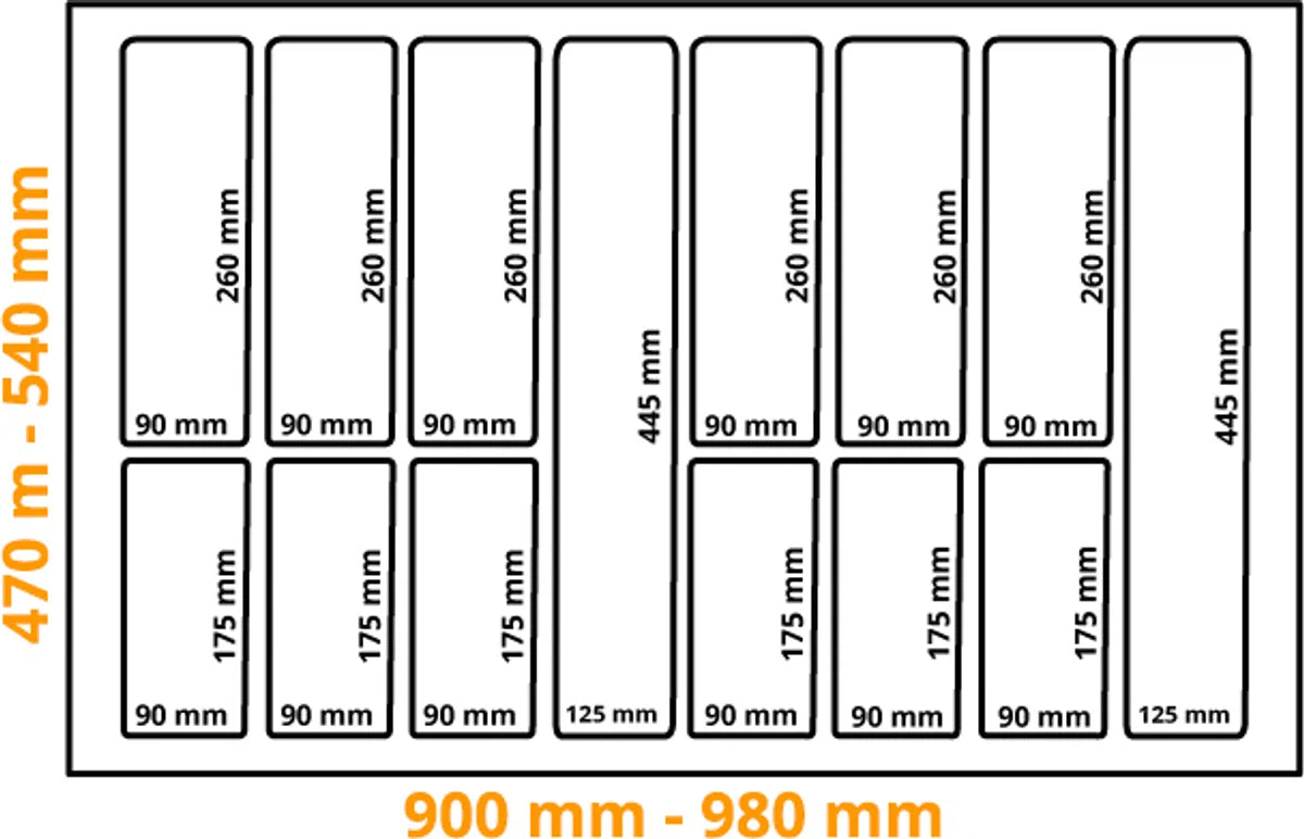 De bestekbakken van kunststof zijn aanpasbaar in de breedte en diepte. Bestekbakken van kunststof zijn namelijk eenvoudig op maat te snijden. U kunt de bestekbak een aantal keer insnijden en hierna het overbodige kunststof afbreken. In de breedte is de bestekbak aan te passen van 90 cm tot 98 cm. De diepte van de bestekbak is aanpasbaar van 47 cm tot 54 cm.