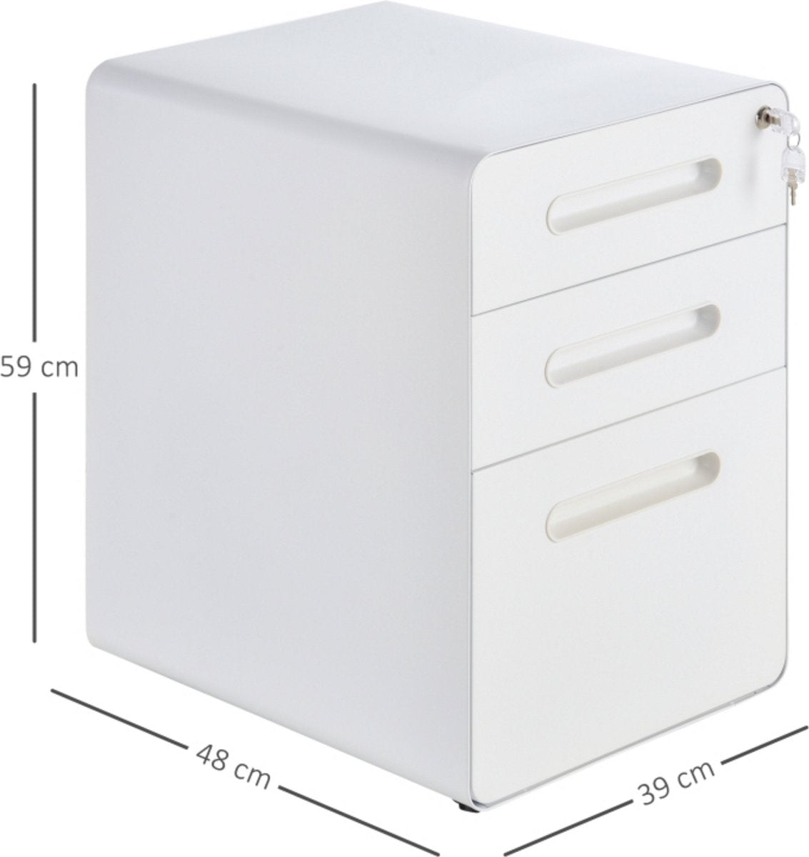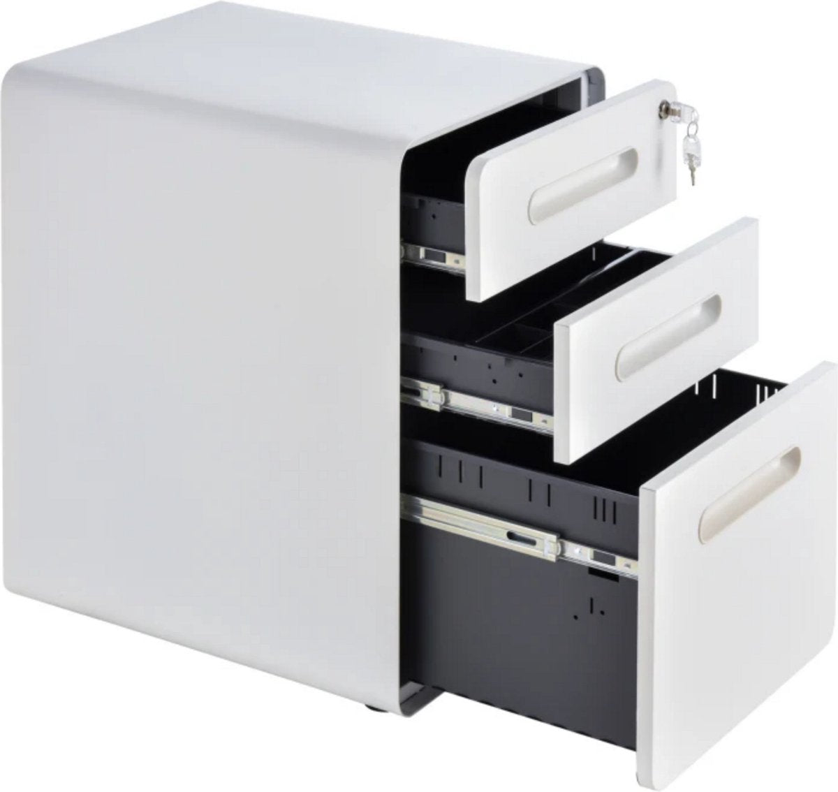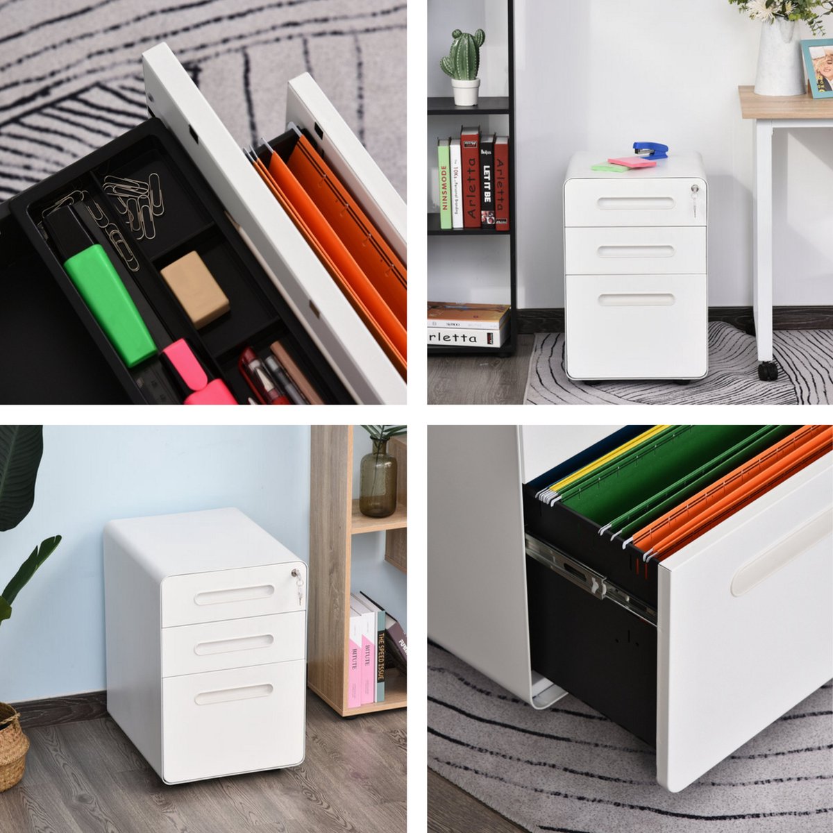 Gebruik deze mobiele archiefkast om je belangrijke documenten netjes, veilig en beschermd op te bergen. Dit ladeblok biedt veel opbergruimte, heeft 2 lades voor je kantoorbenodigdheden en een grote lade voor hangmappen en andere belangrijke documenten. Dit verticale ontwerp heeft een aantrekkelijke afwerking en is compact gebouwd voor kleinere ruimtes, perfect voor thuis of op kantoor. Dankzij de 4 zwenkwielen is hij gemakkelijk te verplaatsen in huis of op kantoor. De bureaukast is gemaakt van duurzaam staal en kan jarenlang worden gebruikt. Daarnaast heeft de bovenste lade een slot dat alle drie de lades tegelijk kan vergrendelen om je privacy te beschermen.