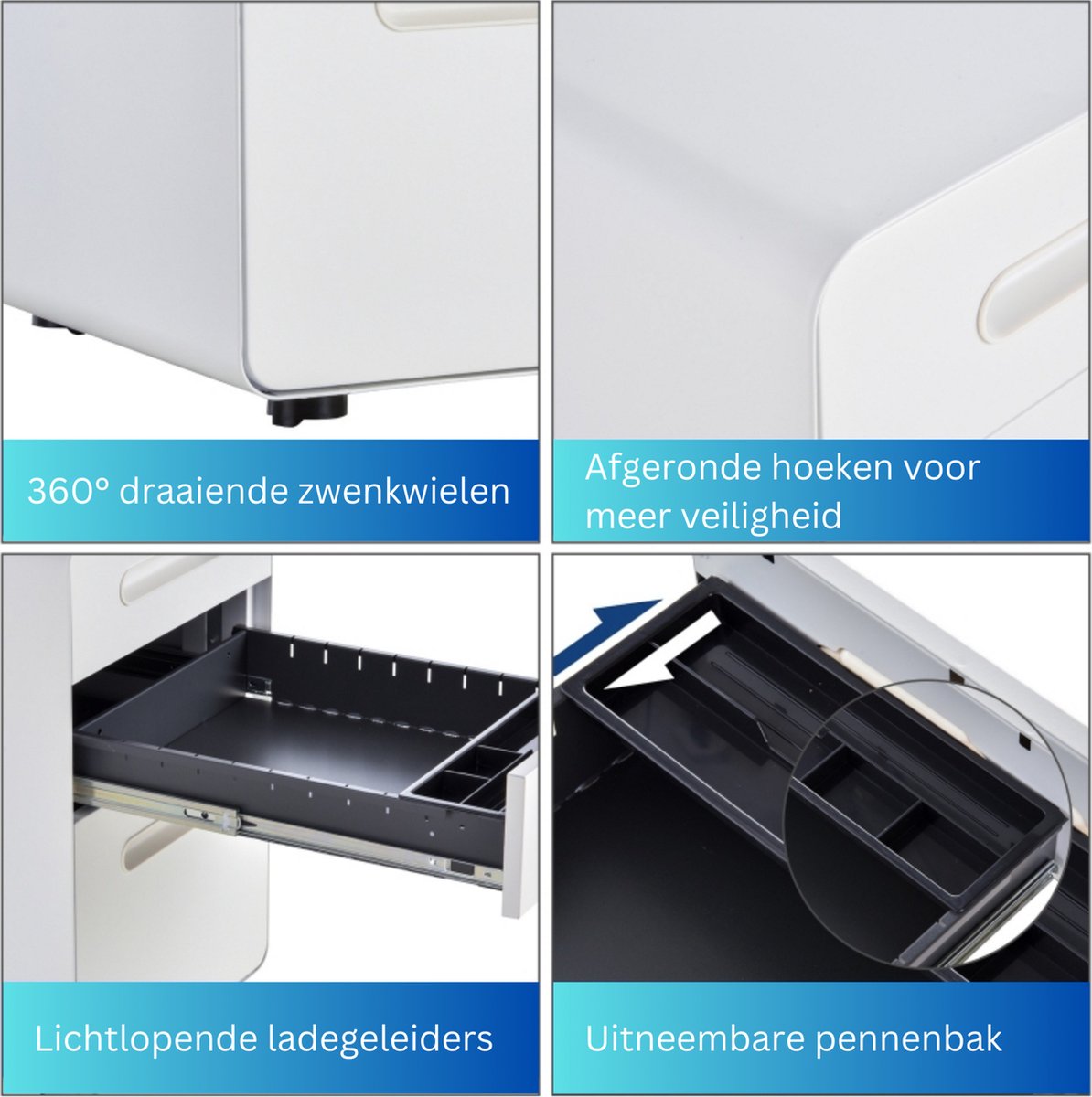 Ladeblok - Ladeblok bureau - bureaukast - Archiefkast - 3 lades - Met slot - Staal - Wit