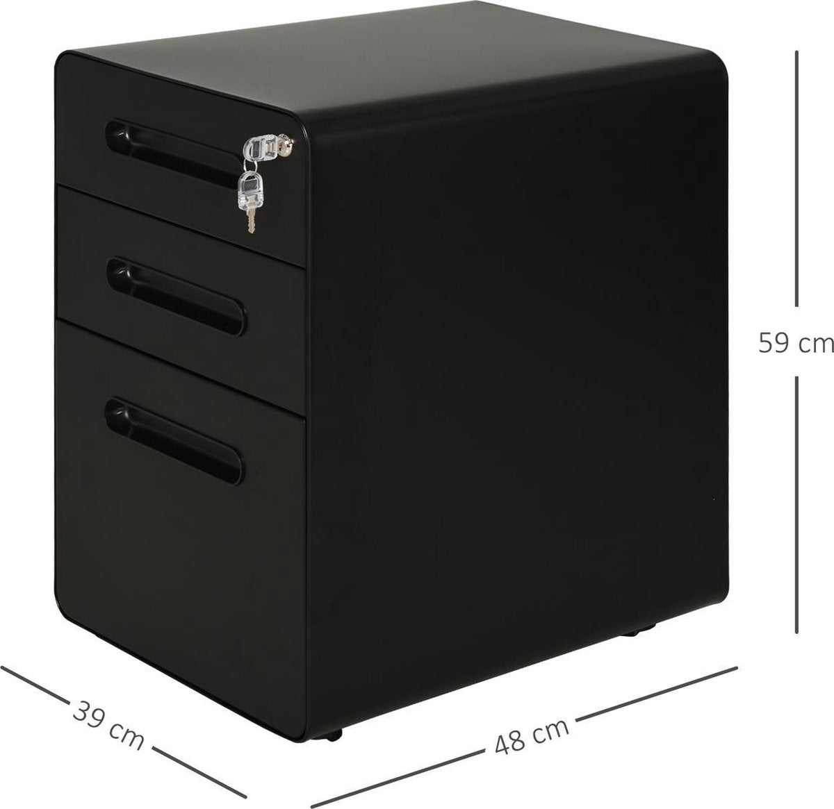 Gebruik deze mobiele archiefkast om je belangrijke documenten netjes, veilig en beschermd op te bergen. Dit ladeblok biedt veel opbergruimte, heeft 2 lades voor je kantoorbenodigdheden en een grote lade voor hangmappen en andere belangrijke documenten. Dit verticale ontwerp heeft een aantrekkelijke afwerking en is compact gebouwd voor kleinere ruimtes, perfect voor thuis of op kantoor. Dankzij de 4 zwenkwielen is hij gemakkelijk te verplaatsen in huis of op kantoor. De bureaukast is gemaakt van duurzaam staal en kan jarenlang worden gebruikt. Daarnaast heeft de bovenste lade een slot dat alle drie de lades tegelijk kan vergrendelen om je privacy te beschermen.