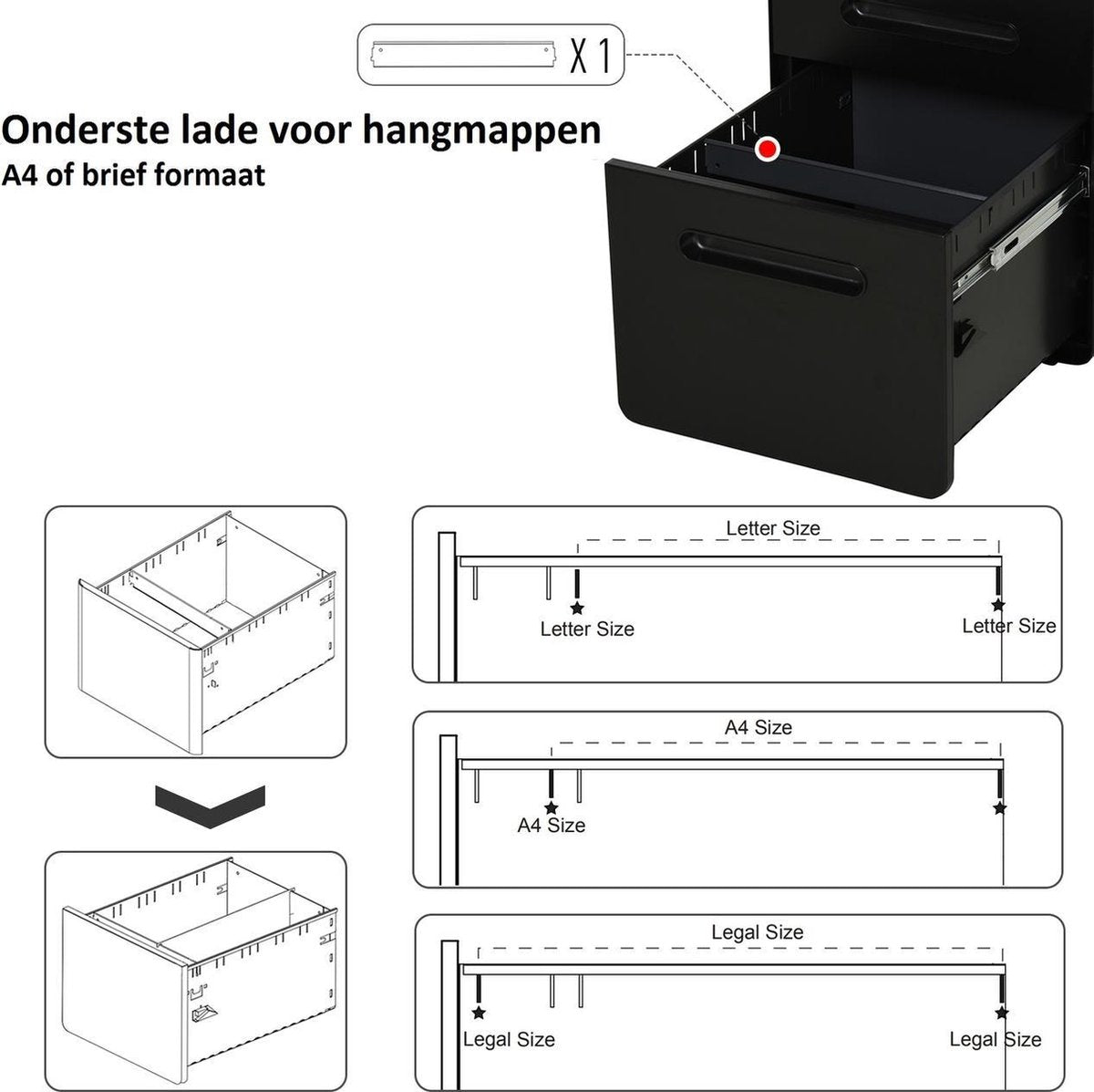 • Een grote lade voor hangmappen (Legal-formaat, A4, Letter-formaat)