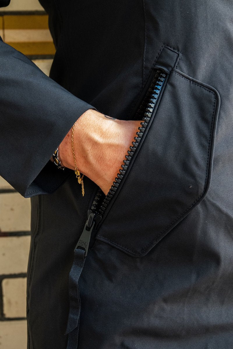 - Bewegingsvrijheid: volledige bewegingsvrijheid door de sterke deelbare rits en twee zijritsen. De middelste rits kan dus van beneden naar boven, wel zo handig op de fiets of als je de auto in wilt stappen.